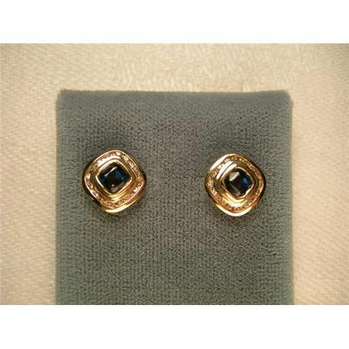 You are looking at a pair of estate 14K yellow gold earrings with sapphires and diamonds. Each piece in this beautiful set features one natural square shaped sapphire, measuring 4 mm by 4 mm, surrounded by 16 brilliant round diamonds, each measuring less than 1 mm in diameter. The total weight of the diamonds is .16 of a carat. Each earring measures 3/8 of an inch long by 3/8 of an inch wide. The pair weighs 2.3 grams. They are in mint condition.