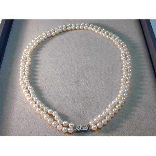 This is a beautiful estate cultured pearls double strand necklace with 14K white gold filigree clasp. The necklace measures 18.5 inches long. The pearls measure 5 mm in diameter.