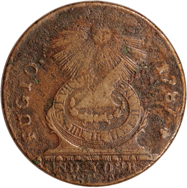 Rarity-6 Very Rare (Only 13-30 known in all grades). 144.3 grains. This is a well detailed example. This major variety is listed and illustrated for type, on page 83 in the Red Book as the "Cross after date" type. This is the "STATES UNITED" version (also known as a K. 1-L variety as listed in Kessler’s book THE FUGIO CENTS) of the Redbook, "Obv Cross After Date, No Cinquefoils" type. This coin appears chestnut to deeper brown in color, having somewhat mottled tone. This coin has not been cleaned and a closer inspection under magnification shows minor roughness to the surfaces plus a few tiny scattered surface bumps. All of the Roman numerals on the sundial are clearly seen, as are “FUGIO,” “1787,” and the important Cross After Date device.