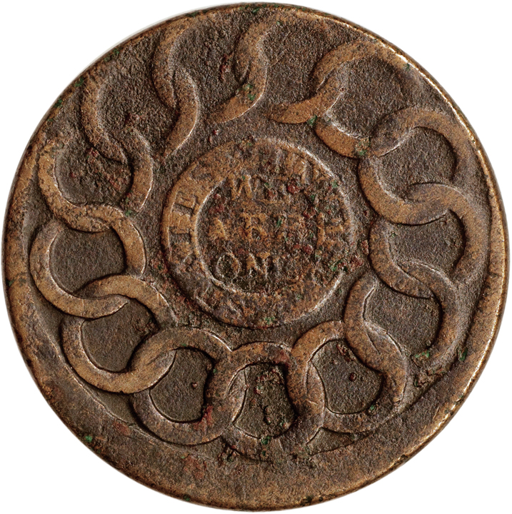 The reverse side is dark brown in color with slightly lighter highpoints with some details of Very Fine. All of the thirteen linked rings and legends “STATES UNITED” and “WE ARE ONE” are clear having just a touch of some surface verdigris and the rims are free of any bumps or bruises. This is a very collectable coin of a major listed FUGIO type, missing in most collections.