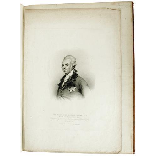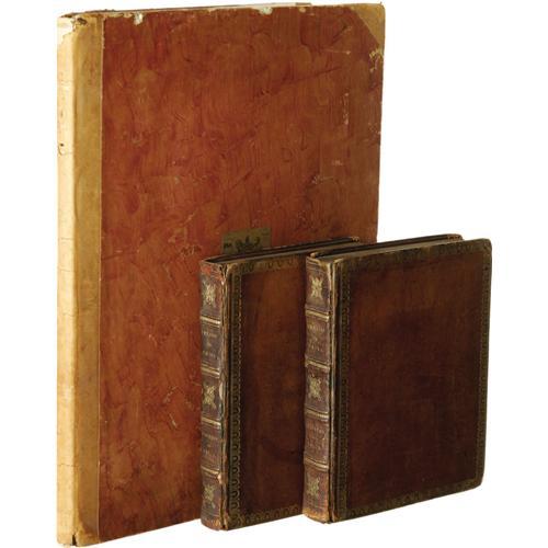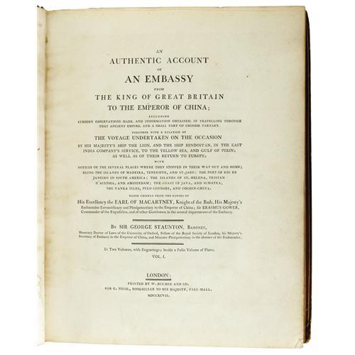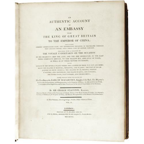 <B>Sir George Staunton:<I> An Authentic Account of an Embassy From the King of Great Britain to the Emperor of China…</B></I></B></I> (London: B. Bulmer and Company, 1797), first edition, two volumes with an elephant folio companion volume of plates, 518 pages and 626 pages respectively, 28 fine copper text engravings, folio volume contains 44 engraved plates including one large fold-out map, extra folio engraving of Earl of Macartney laid in, full leather binding, with gilt titles, decorative devices and gilt dentelle to outside front and rear boards, gilt edges, four raised spine bands, marbled endpapers, 4to (9.5" x 12"), spines faded and cracked on volumes one and two, exterior hinges cracked and exhibit evidence of old repairs, water ring on the front of volume one, former owner's book plates on the free front end paper and inside front cover of both volumes, corners bumped and worn, interior contents in superb condition with virtually no foxing, very good condition. The folio volume, measuring 17" x 23", is bound in full leather with an unusual painted finish, with worn corners. The folio volume has been rebound, and during the process, many of the plates were rebound out of sequence, but the volume is complete and the contents in very good condition. This is an important set seldom seen in its complete state.<BR><BR><b>Shipping:</b> Books & Catalogs (<a target="_blank" href="http://www.heritageauctions.com/common/shipping.php">view shipping information</a>)