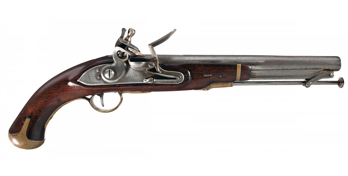 This is an example of a Second Model Flintlock horseman's pistol that was manufactured by the Virginia Manufactory in Richmond, Virginia in 1815. The pistol closely resembles the Harpers Ferry U.S. Model 1805 Flintlock Pistol. The Virginia Manufactory produced an estimated 2,044 Second Model Flintlock Pistols between 1812 and 1815. An estimated 366 pistols were manufactured in 1815 and had distinctive lock markings and are considered to be rare. The pistol has a bright finished barrel, lock and ramrod with brass trigger guard, buttcap, side plate, ramrod tail pipe and barrel band. The wedge fastened stock is oil finished black walnut. The round smoothbore barrel does not have front or rear sights and has a prominent under-rib with attached swivel and button head ramrod. The lock plate is flat with beveled edges, a prominent tip, and integral fenced flash pan. The reinforced hammer has a flat face and a notched hammer spur. The frizzen has a curved toe. The lock plate is stamped with the date "1815" in a vertical line behind the hammer and "RICHMOND" in an upward curve below the pan. These markings are found only on the 366 Second Model Virginia Manufactory pistols manufactured in 1815. The brass buttcap has the distinctive spurs on the sides and the trigger guard has a pointed front finial. The letter "V" is stamped three times on the inside of the trigger guard. The Second Model Virginia Manufactory pistols remained in state service until the Civil War with some examples issued to cavalry regiments at the start of the war. The pistol is considered to be a secondary Confederate handgun.