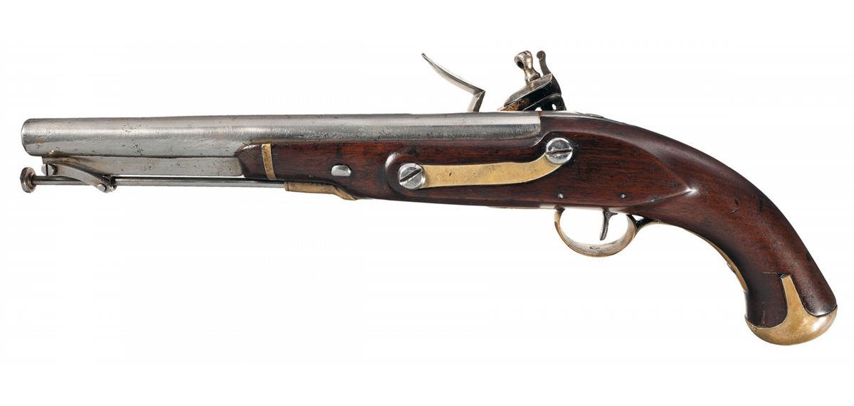 Condition: Very good as reconverted. The pistol has been expert reconverted from percussion to flintlock configuration. The pistol has been carefully cleaned. The surfaces of the barrel and lock are generally smooth. There is some minor pitting surrounding the flash hole. The re-engraved lock markings are crisp. The brass furniture is very good with an attractive unpolished patina. The stock has been lightly sanded and is good with a repaired crack on the right side extending fromt the lock plate to the forend, smaller repaired cracks on the right side of the butt and on the left side of the stock between the tail pipe and side plate. This is a solid representative example of a rare Secondary Confederate handgun that is extremely difficult to obtain in any condition.