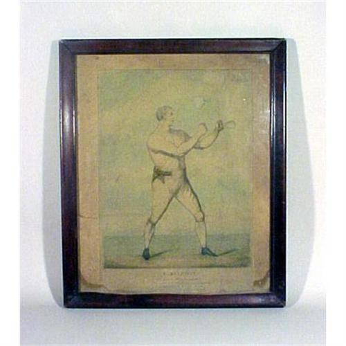 This is a very rare and historical etching of the boxer Edwin Baldwin. Baldwin is very fit and quite muscular! He is dressed in boxing garb from the period with a decorative orange, green and yellow cloth belt. Below Baldwin it reads ? E. Baldwin known as White-headed Bob; born in 1800 at Ludlow in Shropshire - stands 5ft 1in weighs 13 stone. Pub April 1829 by S.W. Fores 41 Piccadilly. On the bottom left hand corner it is signed ? Tom Jones fec - with a side ways J. I found the following information on ?white-headed bob? - His name was Edwin Baldwin and he was a friend of the famous boxer Tom Spring (1795-1851). In some documentation on Spring I found that ? Tom Spring seconded a native of Ludlow, Edwin Baldwin, known as 'White Headed Bob' at his fight with teenage Ned Neale at Virginia Water, Surrey on October 19th 1824. Disappointingly for the men from the Marshes, victory was not with them that day. I was also able to find a poem by Richard Harris Barham entitled Black Mousquetaire: A Legend of France which was written in 1830. In the poem Barham mentions a boxer called ?White-Headed Bob.? An excerpt from that poem is as follows: