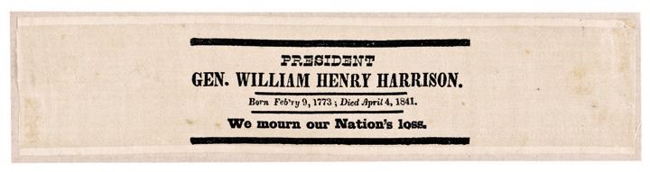 Extremely Rare, Horizontal Printed Typeset Text Format, 7” x 1.5”, tipped to light fabric stock for display, overall size of 7.25” x 1.75” original “Mourning” Silk Commemorative Ribbon for President William H. Harrison. The Horizontal Text, located between two heavy black lines above and below, reads: “PRESIDENT GEN. WILLIAM HENRY HARRISON. Born Feb’ry 9, 1773; Died April 4, 1841. We mourn our Nation’s loss.” The very first such Silk Ribbon of this major design we have offered.