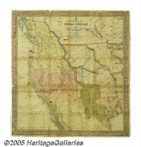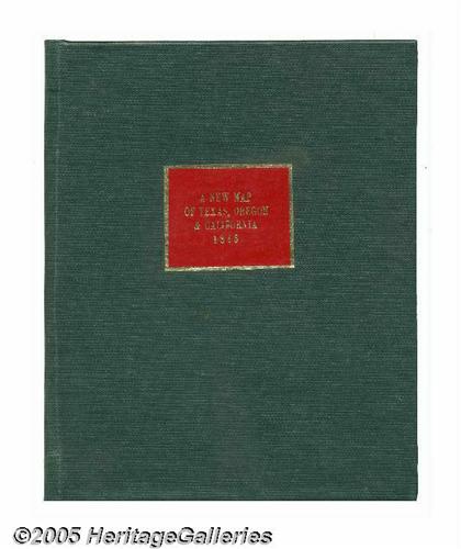 <B>Rare 1846 Map - Mitchell's New Map of Texas, Oregon and California</B></I> <I>"Mitchell's New Map of Texas, Oregon and California with the Regions Adjoining. Compiled from the most recent authorities. Philadelphia Published by S. Augustus Mitchell N.E. Corner of Market & Seventh Streets 1846."</B></I> Offered here is an original first printing of this legendary map showing the region extending from the Mississippi to the Pacific coastline, and from the Rio Grande to southern Canada. This was the most popular map of the West up to that point and was very influential on other cartographers of the period as well as early emigrants to the area. Known as one of the the first maps to show Texas as a state, it was also the map that Brigham Young used in preparation for the Mormon westward migration in 1846. Lithographed and beautifully hand-colored on quality paper, linen-backed with separation at the original folds. Several ink and pencil notations appear to be contemporary with its publication. Included is a titled custom book-bound folder with marbled papers endpapers. A rare opportunity to own this important and desirable map. Lot:253