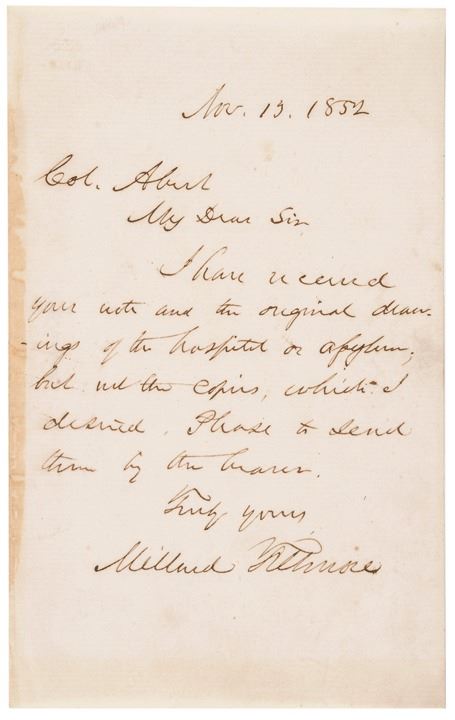 November 13, 1852-Dated, rarely encountered, Autograph Letter Signed “Millard Fillmore,” as President of the United States, 1 page, 5” x 8”, Choice Extremely Fine. A brief but scarce letter by Fillmore, penned during his short presidential term, regarding plans for a hospital. This ALS reads, in part: “I have received your note and the original drawings of the hospital or asylum; but not the copies which I desired ... Truly yours, (Signed) Millard Fillmore". Fillmore ultimately founded the Buffalo General Medical Center, located in Buffalo, New York, a 511-bed hospital which was built and completed after his death in 1855. Expected folds with faded residual tone from a prior mounting along left edge, not affecting text. Fillmore’s huge 4.25” long brown signature is dark and crisp across most of the sheet at bottom. Docket on the blank verso. Accompanied by an engraved Portrait of Fillmore which his signature in facsimile below. Any “Millard Fillmore” Autograph Letter Signed as President is quite rare. (2 items).