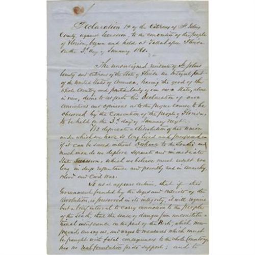 <B>Rare 1860 Florida Declaration Regarding State Secession</B></I>. This is a major historical document, perhaps heretofore unknown and unpublished, in which Florida’s St. Johns county expresses its desire to avoid secession. This eloquent document, surely one of very few copies and possibly the only one extant, was written on the eve of a special convention held in Tallahassee in early January, 1861 to consider whether Florida should leave the Union. On January 10, 1861 the delegates voted 62 to 7 to withdraw Florida from the Union. The declaration, four pages, 8” x 12.5”, on blue-tinted laid paper, St. Augustine, December 22, 1860, is signed by David R. Dunham, B. E. Carr, Bartolo Oliveros, P. B. Dumas, John S. Masters “<I>and fifty one others</B></I>”, slightly toned, else in fine condition. It reads in part: “<I>The undersigned residents of St. Johns County and citizens of the State of Florida an Integral part of the United States of America, having the good of the Whole Country and particularly our State, alone in view, desire to set forth this Declaration of our convictions and opinions as to the proper course to be observed by the Convention of the people of Florida…We deprecate a dissolution of that Union under which we have so long lived and prospered if it can be saved without dishonor to the South; and as much as we deplore Separate and immediate State Secession, which we believe must result ere long in deep repentance and possibly end in anarchy, blood and Civil War…We regard the preservation of the Union, as second only to the rights and interests it was intended to secure. And we would exhaust every means of redress within the Union, before resorting to a disruption of its ties…We would appeal to the Conservatism of the Country, North and South…and that Conservatism should respect the principle of non intervention by Congress with the subject of Slavery…We believe that State Secession is a deliberate abandonment of all the rights and interests secured by valor and wisdom of our Fathers; and that Revolution…Should these just and moderate demands be not accorded to us or refused, Then, we shall at least meet the Foe with a United South; and with the Tomb of Washington and the city that bears his name within our borders, will as one man embrace the stern and dreadful alternative Revolution! And on the Battlements of our outward wall hand out the Banner of Southern Confederacy…</B></I>”. Attached to the document by wax seal is an autograph copy of David R. Dunham’s cover letter to ex-governor Thomas Brown, who was to take the declaration to the convention on behalf of St. John’s County. A hand-written copy of Brown’s reply is written on the verso of Dunham’s letter. A wonderful document and certainly a museum quality holding. The document is sold with an 8 page, 5.5” x 9” printed pamphlet, dated January 27, 1836, House of Representatives document number 80, titled “Hostile Indians in Florida”, in fine condition. This document relates to provocations which later became known as the Second Seminole War.<BR><BR><BR><b>Shipping:</b> Flat Material, Small (<a target="_blank" href="http://www.heritageauctions.com/common/shipping.php">view shipping information</a>)