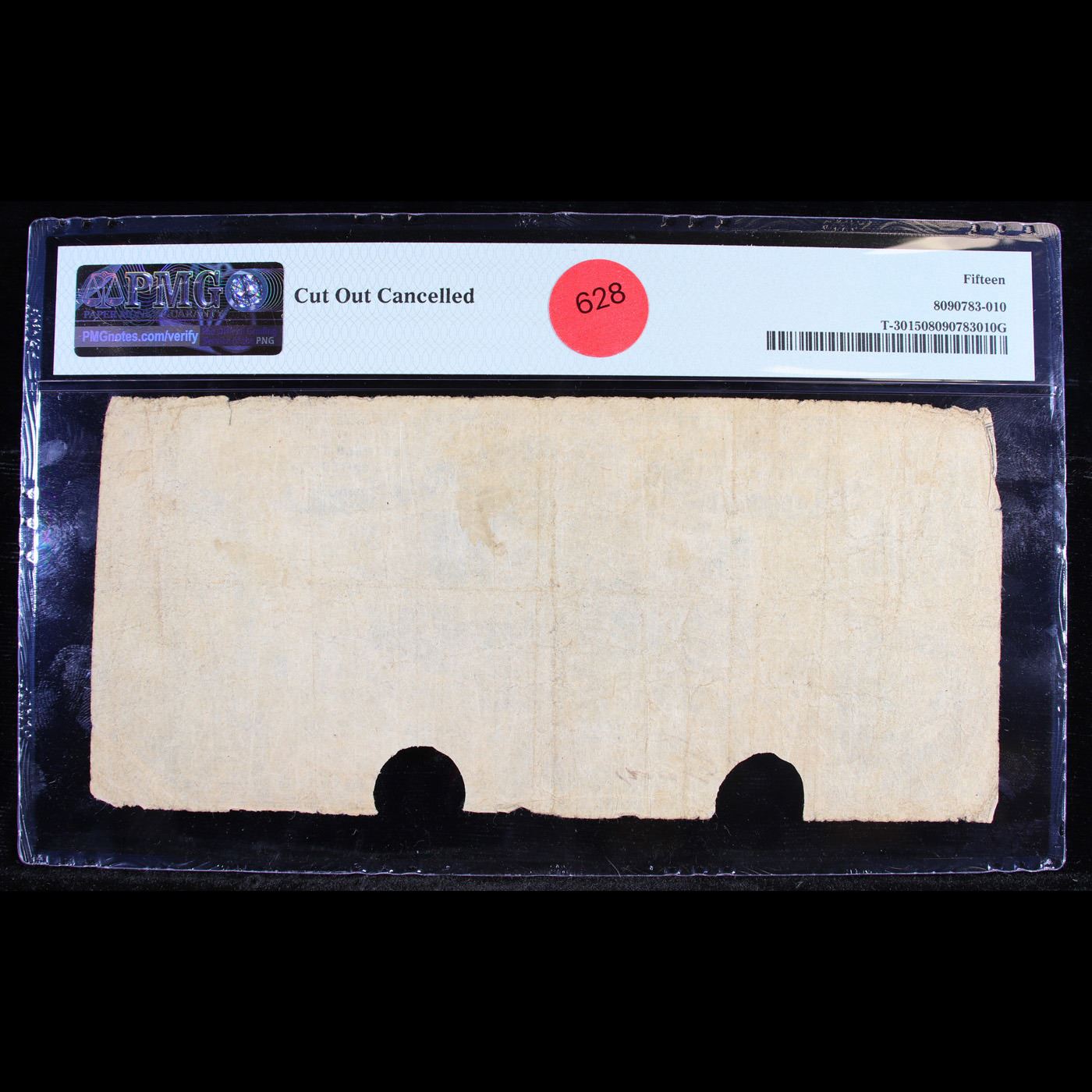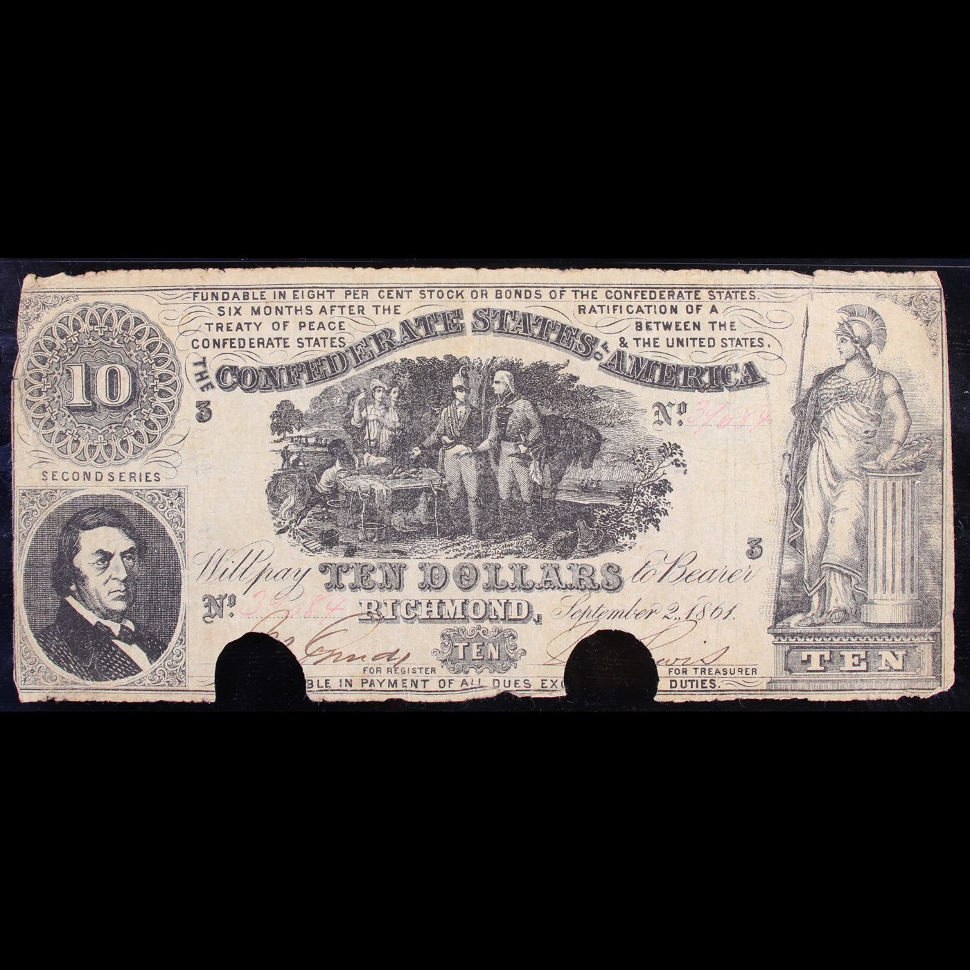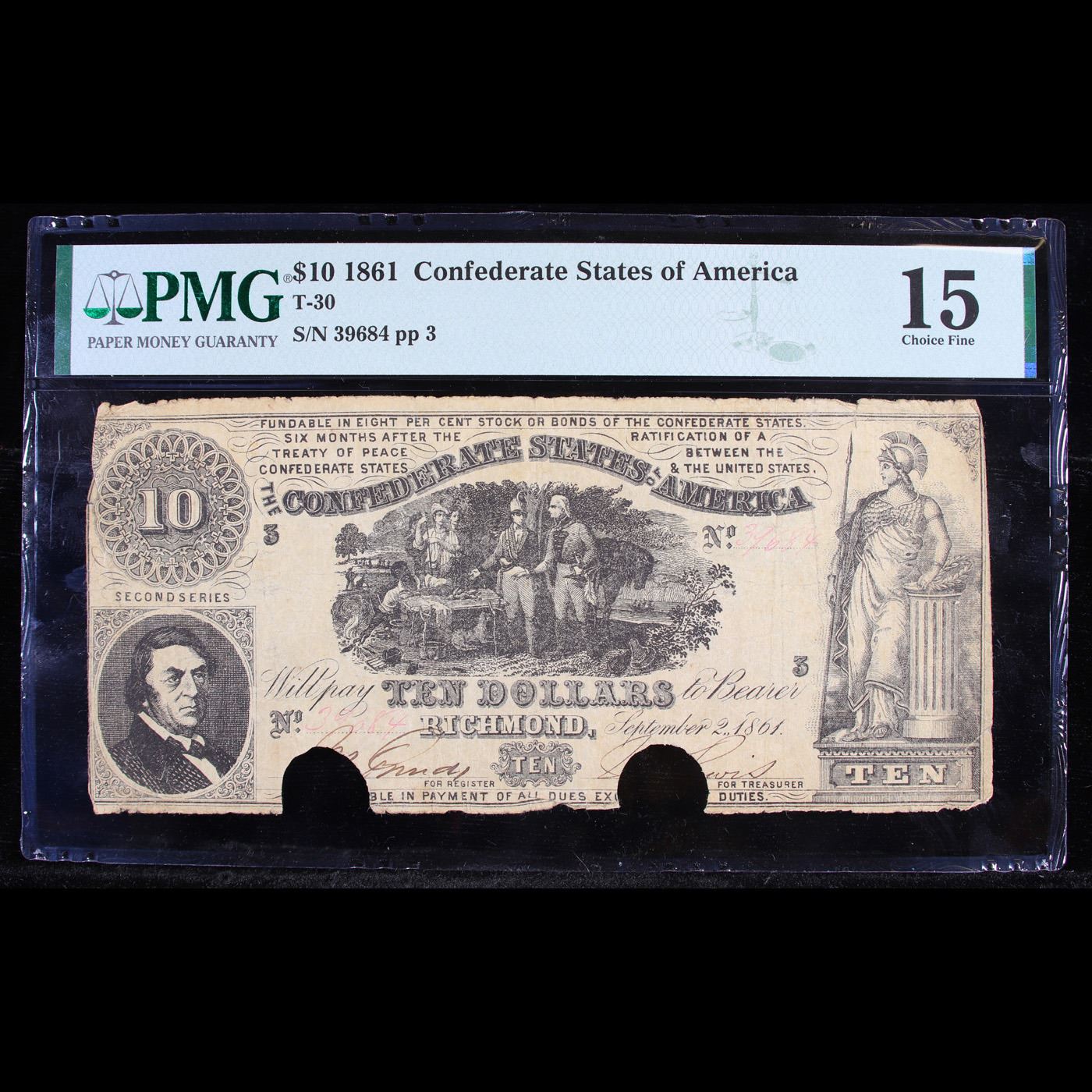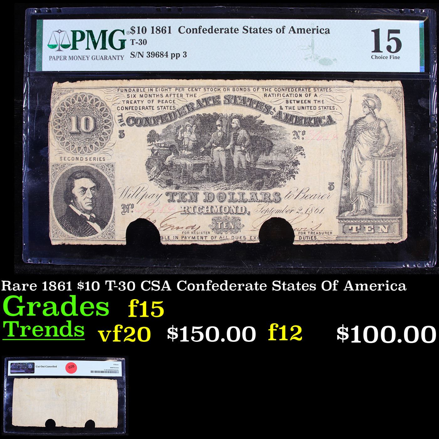 Rare 1861 $10 T-30 CSA Confederate States Of America Graded f15 By PMG. This $10 Confederate note shows a group of Revolutionary War soldiers in the center and has a portrait of R.M.T. Hunter in the lower left corner. On the right side of the note is a woman (Minerva) standing in flowing robes holding a spear. This note was printed with black ink. This note has no design on the back.