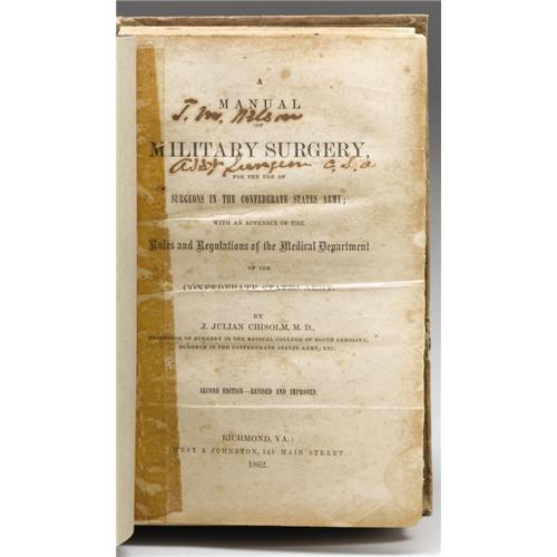 <B>Extremely Rare 1862 <I>Manual of Military Surgery For the Use of Surgeons in the Confederate Army; With an Appendix of the Rules and Regulations of the Medical Department of the Confederate States of America</B></I></B></I> by J. Julian Chisolm, M.D., published by West & Johnston, Richmond, Virginia, second edition, revised and improved, 514 pages, 8vo (5" x 8.25"), re-bound in the original boards, replaced end papers, moderate foxing to all the pages, residue from old cellophane tape present on title page, missing pages 219 through 230 and 235 through 238, boards well worn and stained, cloth missing to the head and tail of spine, but in overall good condition. This is a fascinating look at Confederate medicine, health, hygiene, and the society of soldiers through 1862 eyes. The index is rife with intriguing entries such as <I>"Advice to surgeons left with the enemy",</B></I> <I>"Bayonet wounds",</B></I> <I>"Amputation of arms",</B></I> <I>"Coffee for soldiers",</B></I> <I>"Disturbing influences of wounds",</B></I> <I>"Malingering, or feigning disease",</B></I> <I>"Round balls, effects of",</B></I> etc. Further enhancing this book is the signed name on the title page of either a <I>"T. W. Nilson"</B></I> or <I>"T. W. Nelson"</B></I> under which is signed <I>"Asst. Surgeon C.S.A.".</B></I> Accompany the book is a hand written letter from a F. T. Hambrecht, M.D. giving the former owner some leads about the possible identity of the <I>"Nilson"</B></I> or <I>"Nelson"</B></I> in question.<BR><BR><b>Shipping:</b> Books & Catalogs (<a target="_blank" href="http://www.heritageauctions.com/common/shipping.php">view shipping information</a>)
