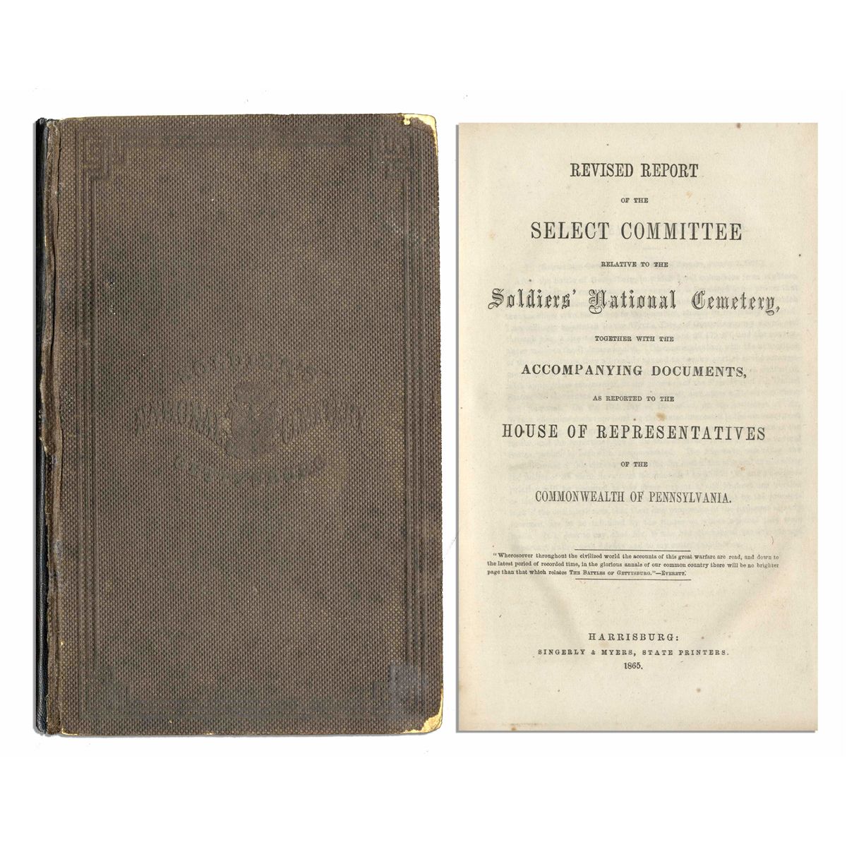 ''Revised Report of the Select Committee Relative to the Soldier's National Cemetery,'' published by Singerly & Myers: Harrisburg, PA: 1865 second edition. Stunning record of burials at Gettysburg features illustrated frontis, maps and transcription of Lincoln's address. Measuring 6'' x 10'', book runs 212pp. Postcards attached to rear pastedown, previous owner's stamps to endpapers and expected shelf wear. Original backstrip has been replaced with leather. Binding is tight and interior is clean. Very good condition.