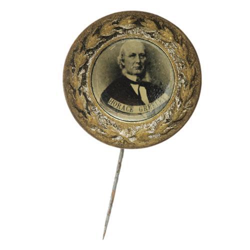 <B>Rare 1872 Horace Greeley Ferrotype Pin in Pristine Condition.</B></I> Greeley is tough in any form, and especially in this condition. The brass shell frame retains much of its original silvering and luster, and the ferro itself is mint and perfectly centered. Original pin on reverse, of course. All in all, a virtually unimprovable example. Diameter 24mm.