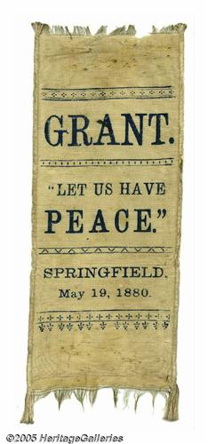 <B>Rare 1880 Ulysses S. Grant Third Term "Hopeful" Ribbon</B></I> In 1879-80 Grant embarked on an extensive national tour whose ill-concealed intent was to sound out support for a run for a third term in 1880. However, even then, the tradition of a two-term limit for Presidents was firmly established; the trial balloon provoked significant opposition and little support. We have not seen this May, 1880 ribbon variety before. Light "aging," good overall shape. Length 5.25". Lot:258