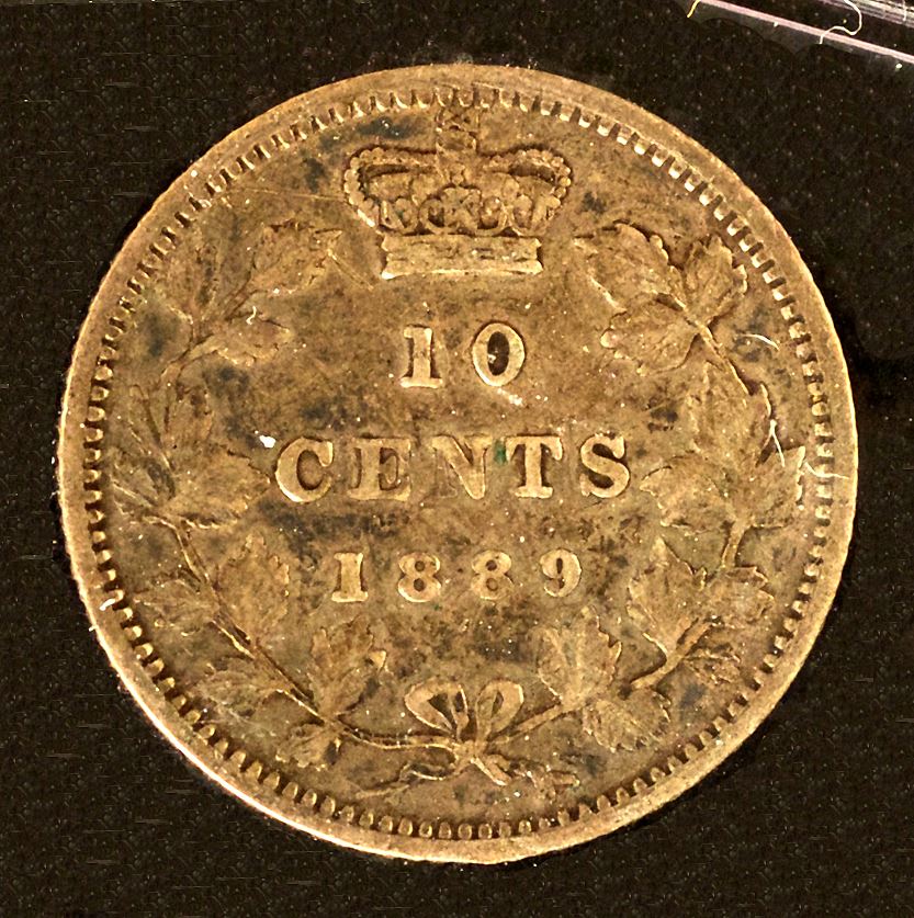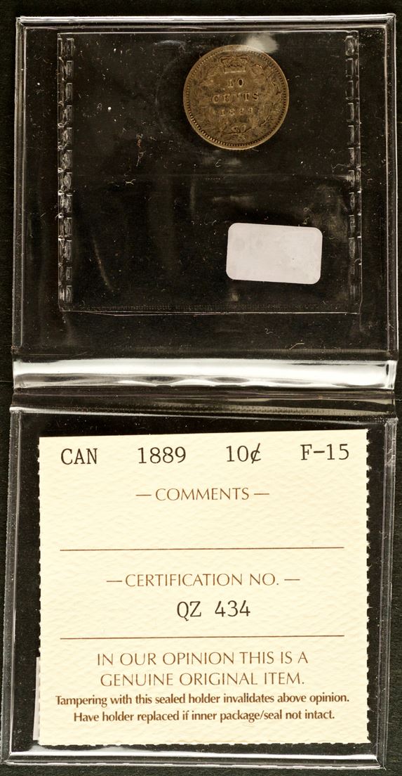 Ten Cents, 1889, graded by ICCS Fine-15. Even medium tone.