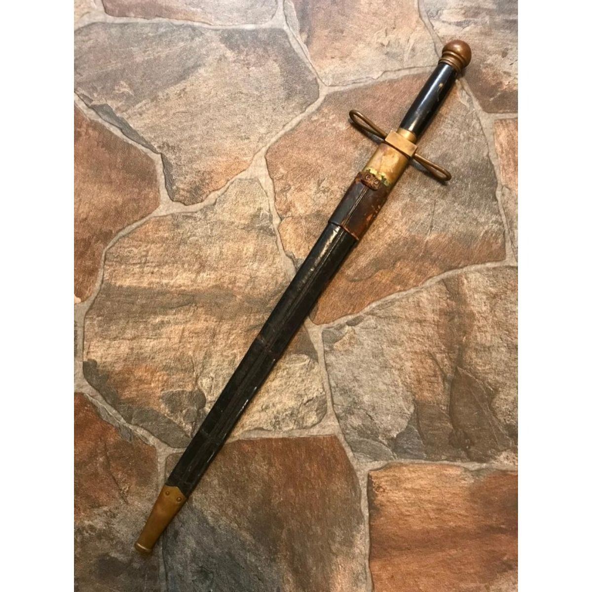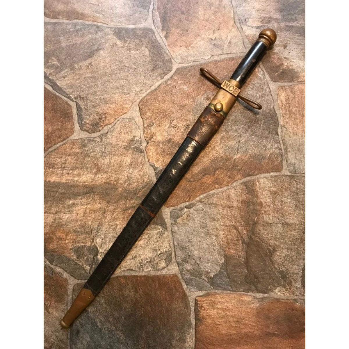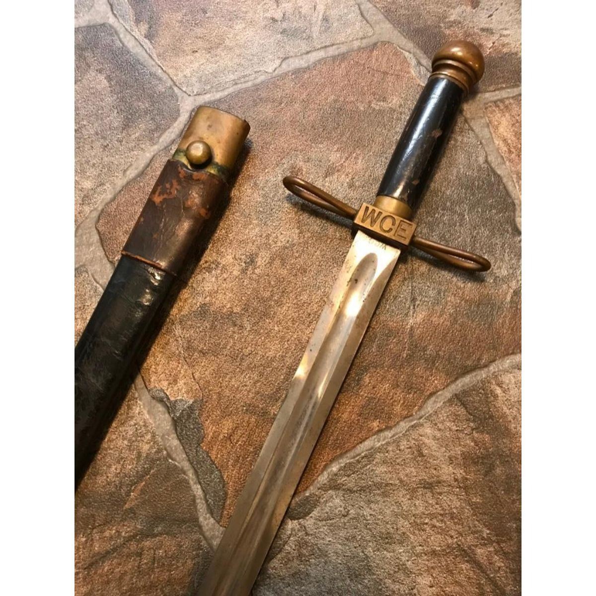 Rare 1893 Exposition Guard's short sword from the World's Fair Columbian Exposition, Chicago. This sword was made by the Ames Sword Co. and marked W.C.G. ( World’s Columbian Guard ) and serial numbered 1434 on the ricasso, made specifically for the Chicago 1893 World Columbian Exposition & worn by all of the Columbian Guards at the 1893 Chicago World's Fair as their sidearn. At the peak, there were 2500 guards. The sword has a brass hilt with a black painted wooden grip. The pommel was in the shape of a half-globe, a theme echoed on the Guards’ buttons. The crossguard is two brass ellipses, hollow inside, that join at a quillon block with the letters “WCE “deeply cast into it. The blade is straight, double edged, and has a single fuller running down the middle of the blade until it tapers out about 6 inches from the point. The scabbard is black leather with brass mounts held on by brass rivets. Together with the original leather sheath. Total length 26". Blade length 20 1/4".  The story of the World Columbian Guard is a very interesting one. The Guard was commanded by Col. Edmund Rice, who was a Civil War winner of the Medal of Honor for bravery at the battle of Gettysburg. The WCG was largely composed of former US Army Soldiers, many of them veterans of the Civil War. Intended primarily as guides, they ended up pursuing America’s first serial killer. Â