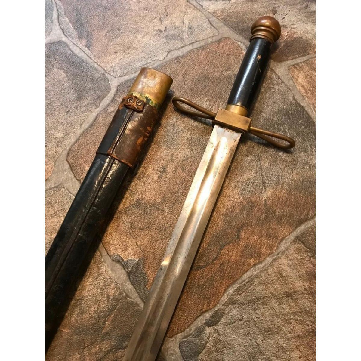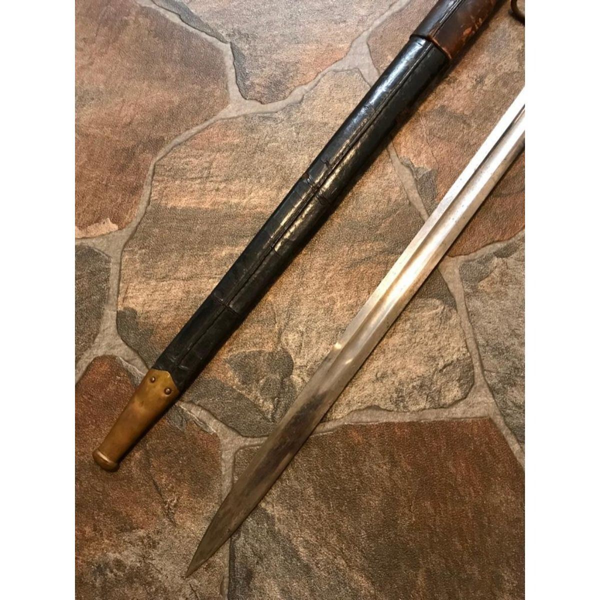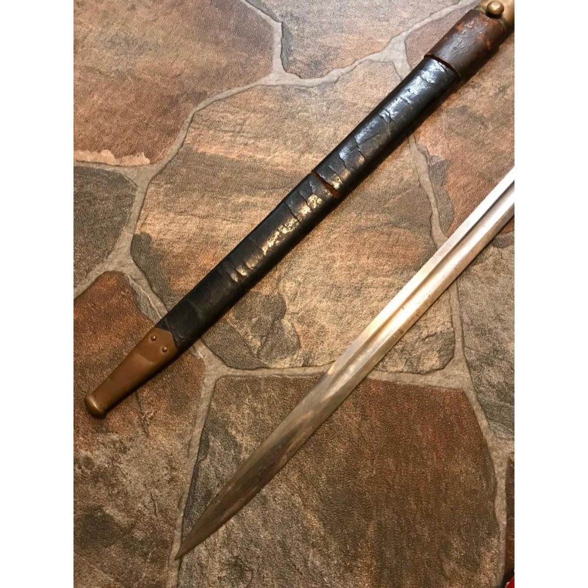 Rare 1893 Exposition Guard's short sword from the World's Fair Columbian Exposition, Chicago. This sword was made by the Ames Sword Co. and marked W.C.G. ( World’s Columbian Guard ) and serial numbered 1434 on the ricasso, made specifically for the Chicago 1893 World Columbian Exposition & worn by all of the Columbian Guards at the 1893 Chicago World's Fair as their sidearn. At the peak, there were 2500 guards. The sword has a brass hilt with a black painted wooden grip. The pommel was in the shape of a half-globe, a theme echoed on the Guards’ buttons. The crossguard is two brass ellipses, hollow inside, that join at a quillon block with the letters “WCE “deeply cast into it. The blade is straight, double edged, and has a single fuller running down the middle of the blade until it tapers out about 6 inches from the point. The scabbard is black leather with brass mounts held on by brass rivets. Together with the original leather sheath. Total length 26". Blade length 20 1/4".  The story of the World Columbian Guard is a very interesting one. The Guard was commanded by Col. Edmund Rice, who was a Civil War winner of the Medal of Honor for bravery at the battle of Gettysburg. The WCG was largely composed of former US Army Soldiers, many of them veterans of the Civil War. Intended primarily as guides, they ended up pursuing America’s first serial killer. Â