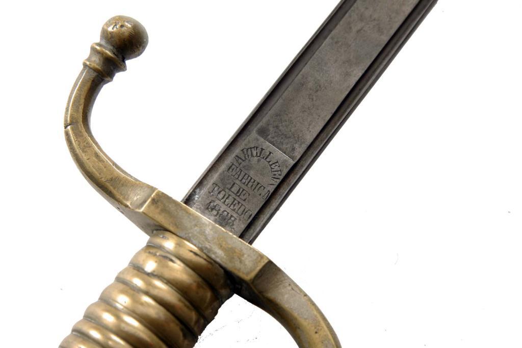Rare 1898 Spanish Short Sword Dog Head Pommel, in good condition. Blade measures 21 3/4", overall measures 27".Dog Head Pommel, in good condition. Blade measures 21 3/4", overall measures 27".