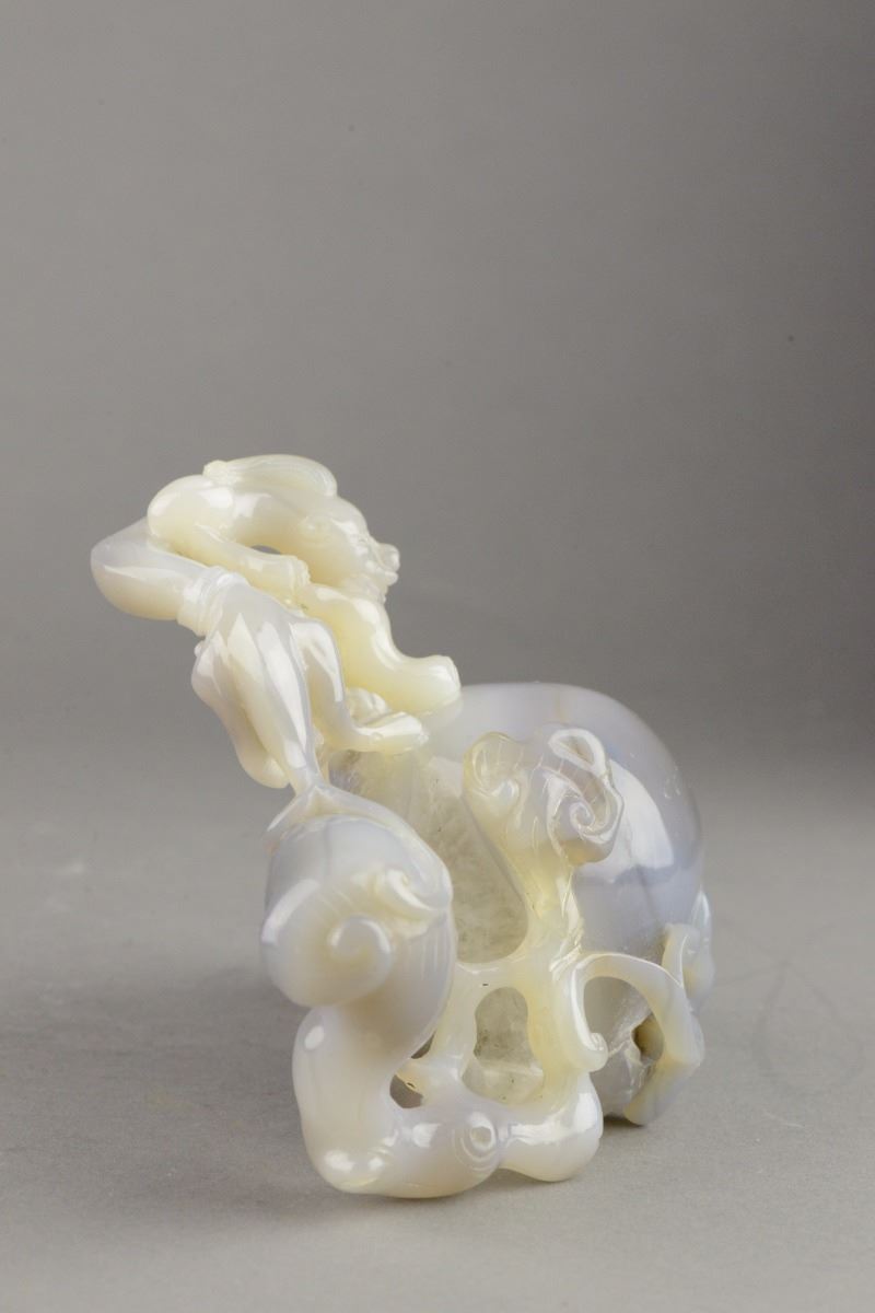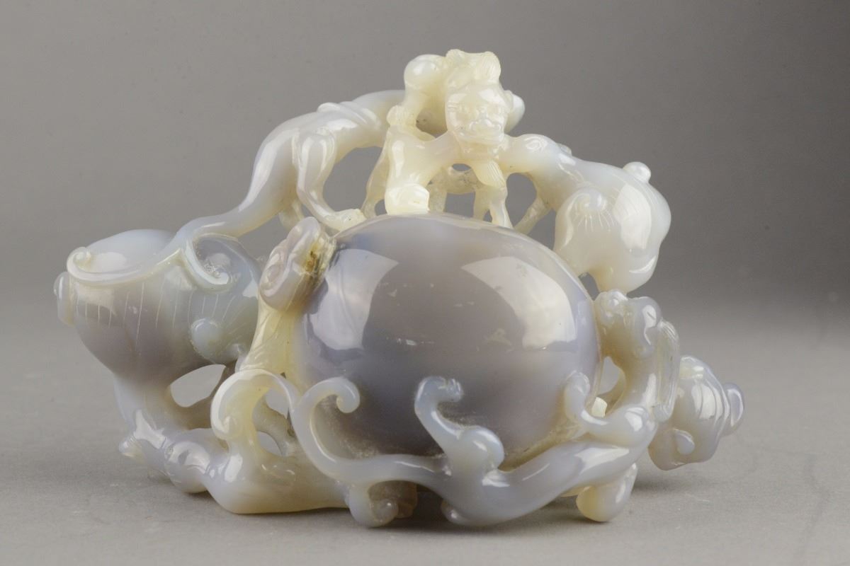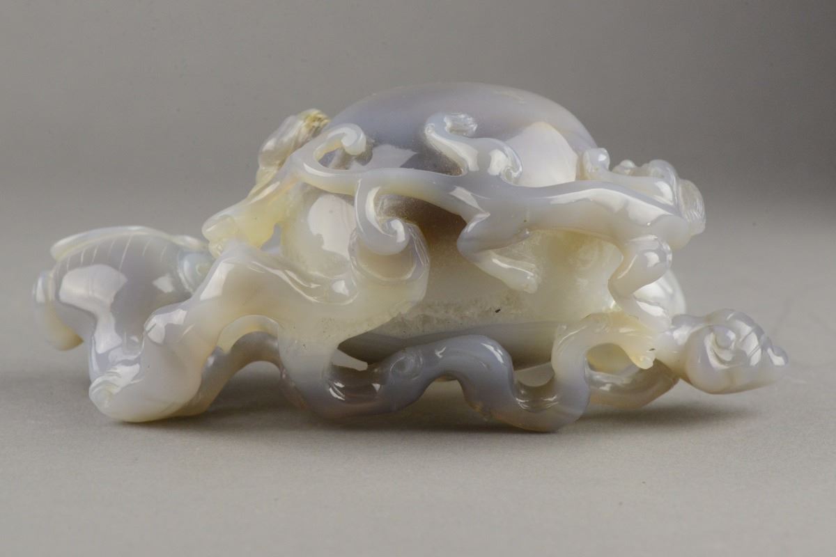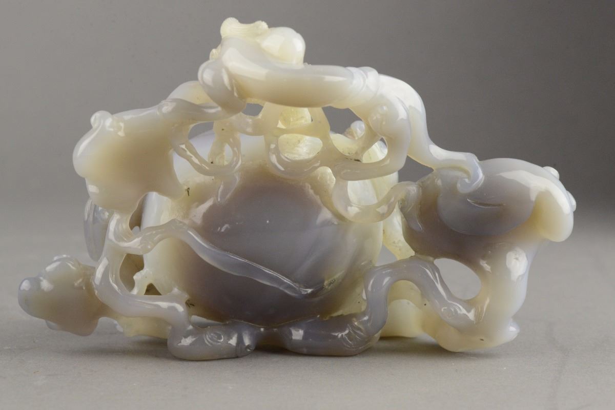 Lustrous and rare, Chinese Agate carved boulder, 18th/19th Century; featuring auspicious fruit, Lingzhi and Chilong; the stone of white and lavender tone; H: 8 cm, L: 17 cm, W: 13 cm, 705 grams