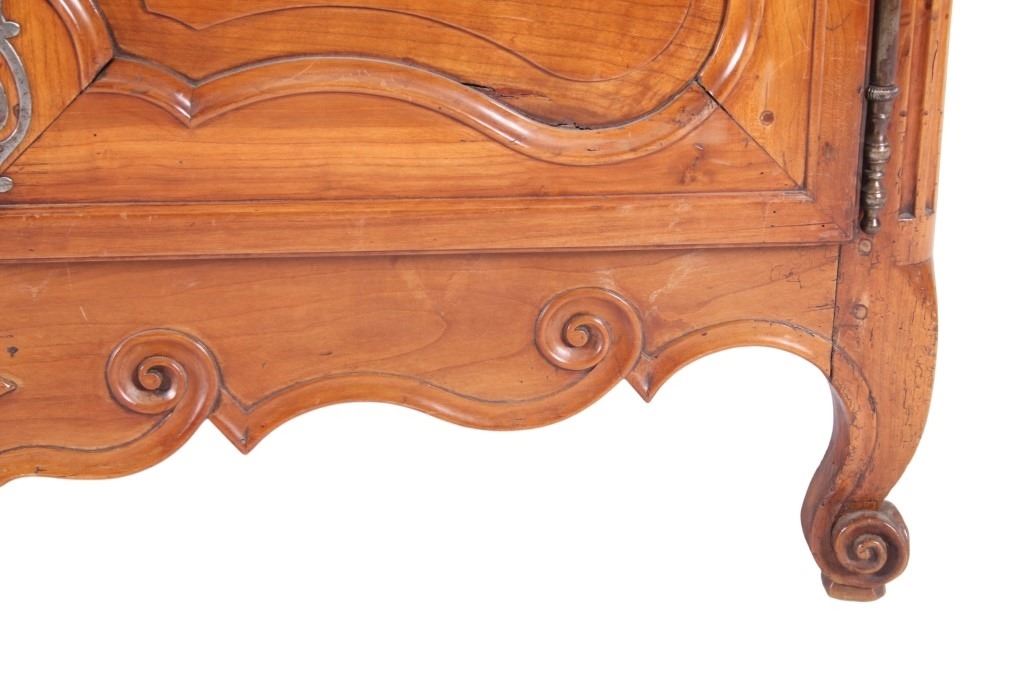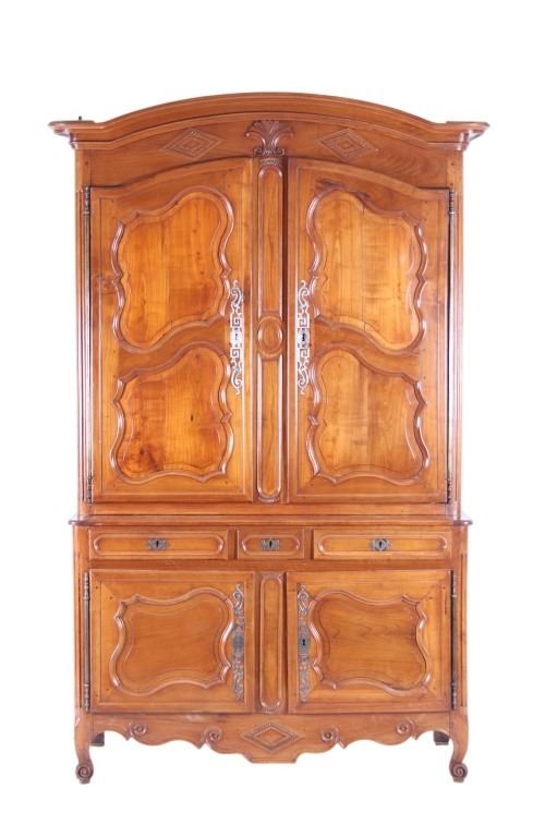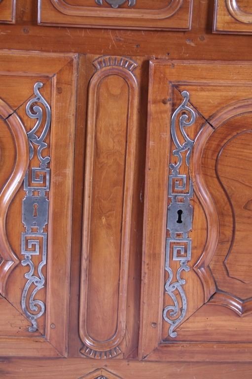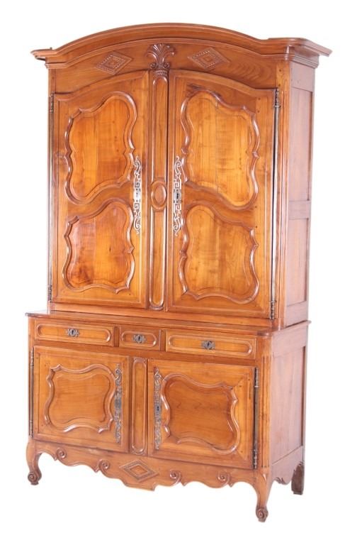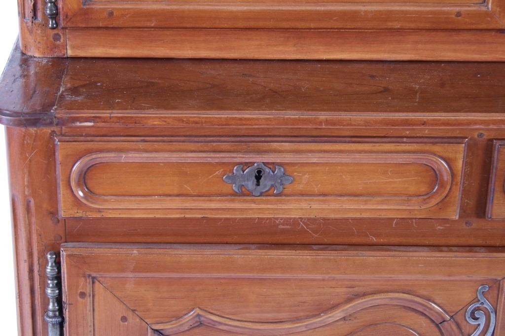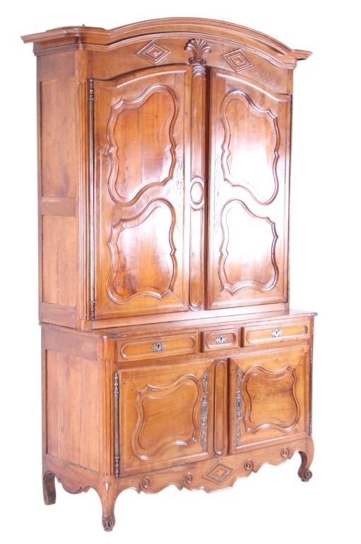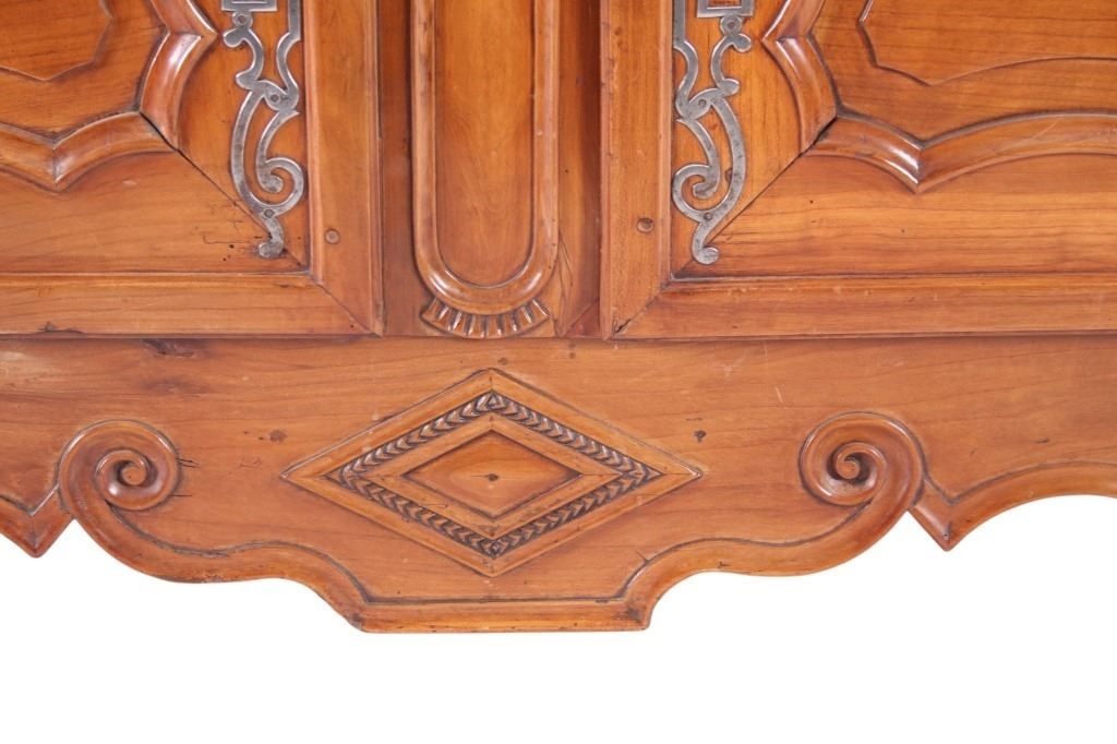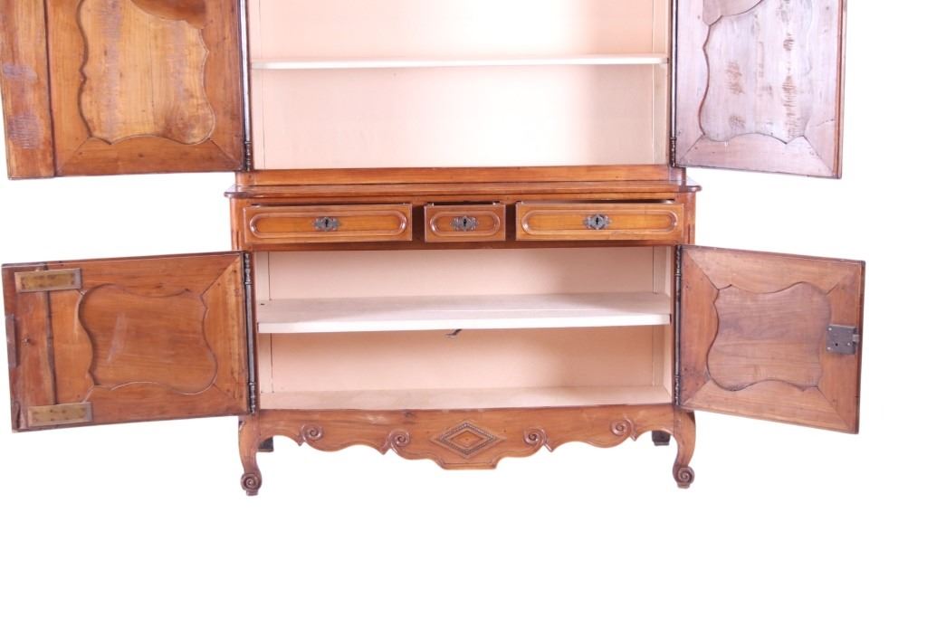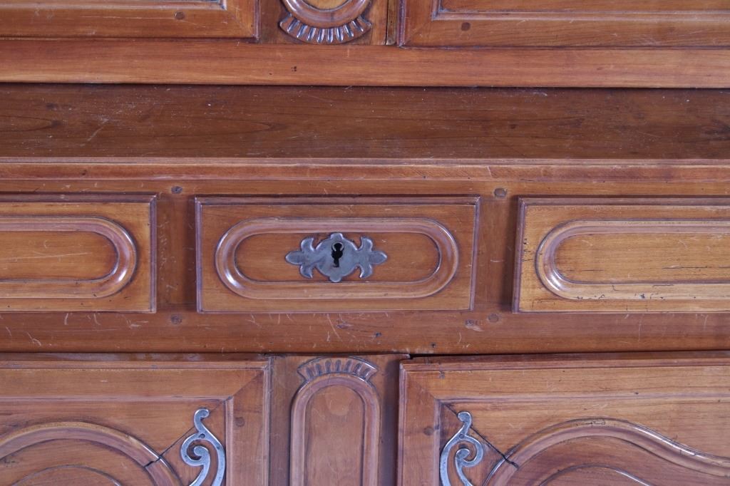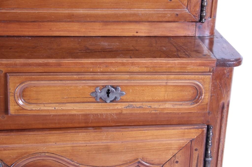 For your consideration is a Rare 18th Century French Provincial Louis XV Oak Buffet a Deux Corps. The eighteenth century is considered the Golden age of French furniture. It was during this time that the most refined and beautiful Royal furniture was made in the busy Paris workshops of Europe's elite cabinet makers. Beautifully crafted and showcasing naturally aged patina on the wood finish, the buffet sideboard draws inspiration from the Provence region of France, French Provincial furniture is known for its graceful, rustic style, and use of natural materials. The upper section of the buffet features two arch carved two-panel locking doors dressed with oversized iron hinges and large decorative openwork iron escutcheons; opening to a beautiful fabric wrapped compartment with three shelves. Cornice is beautifully carved with a centre acanthus flanked by dentil designed diamonds typical of the Provence, Arles region. The bottom section features a Dupont lip three-plank top, three nicely carved locking drawers over two locking lower doors (key included). Interior shelves and drawers are lined in beautiful fabric. Detailed acanthus inspired heavy forged pierced escutcheons hardware. The cabinet has two carved recessed paneled doors dressed with oversized iron hinges and large decorative openwork iron escutcheons; the doors with an attached center panel, open to interior shelving for ultimate storage. Front and side serpentine aprons are nicely carved, scalloped carved front apron features escargot inspired carving with dentil designed diamond typical of Provence, Arles region. Side panels are nicely carved. Excellent quality with superb craftsmanship, the buffet is in wonderfully preserved condition, some finish loss to three-board top. Measures: Top: W 62" H 59" D 17" Bottom: W 57 H 37" D 24", Total: H 96" W 62" D 24" Combined weight is 329 lbs.