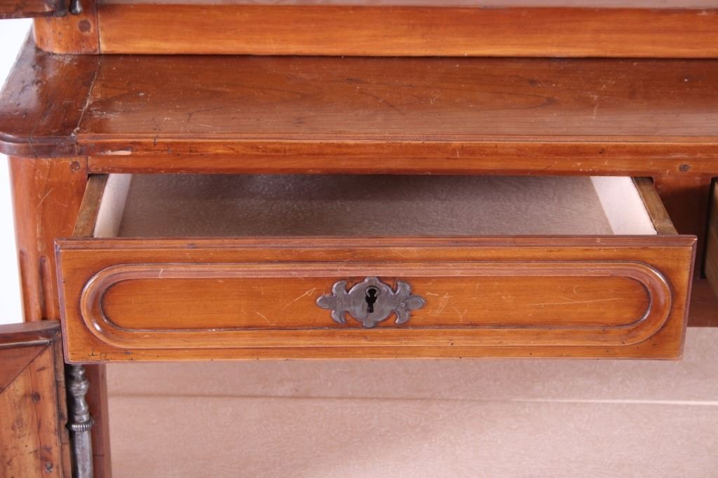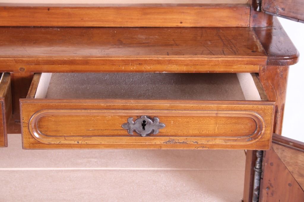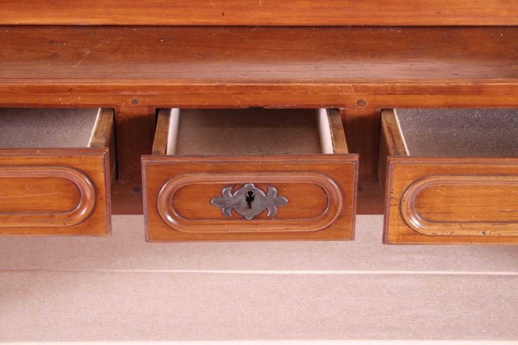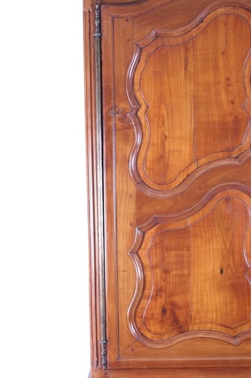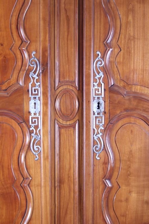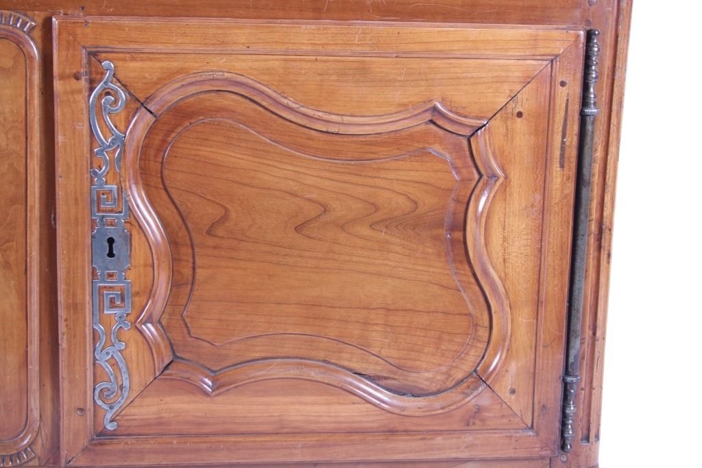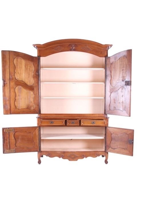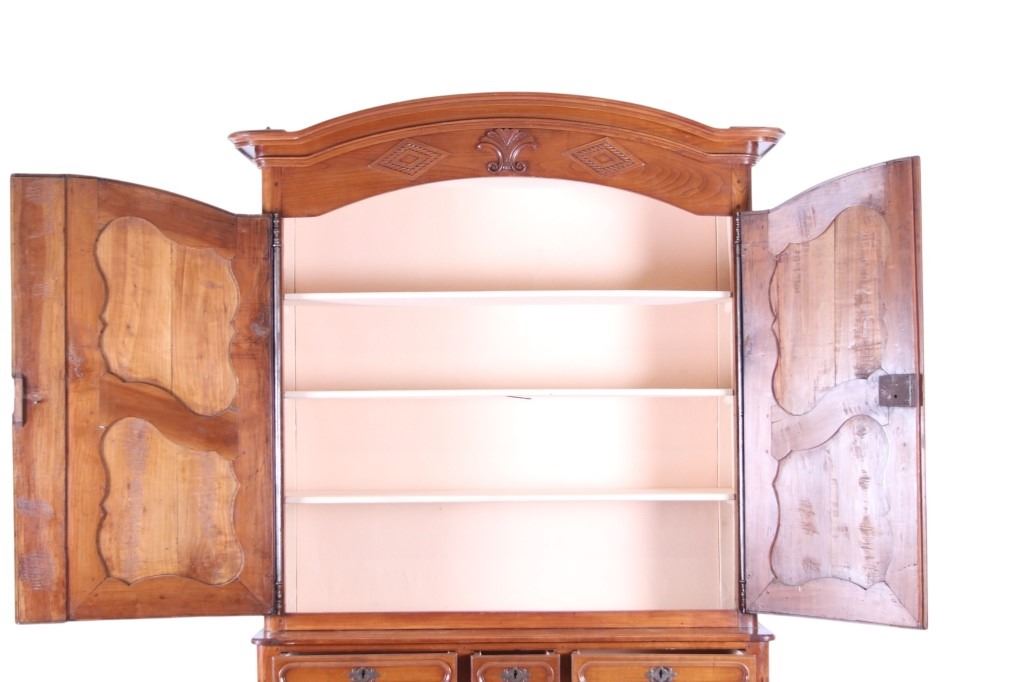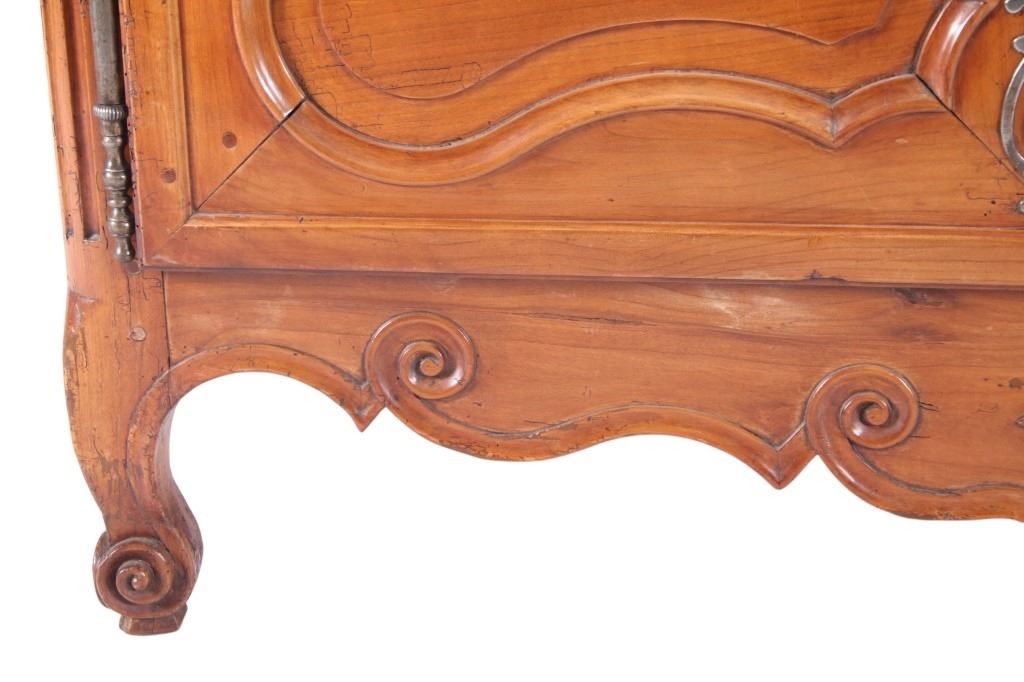 For your consideration is a Rare 18th Century French Provincial Louis XV Oak Buffet a Deux Corps. The eighteenth century is considered the Golden age of French furniture. It was during this time that the most refined and beautiful Royal furniture was made in the busy Paris workshops of Europe's elite cabinet makers. Beautifully crafted and showcasing naturally aged patina on the wood finish, the buffet sideboard draws inspiration from the Provence region of France, French Provincial furniture is known for its graceful, rustic style, and use of natural materials. The upper section of the buffet features two arch carved two-panel locking doors dressed with oversized iron hinges and large decorative openwork iron escutcheons; opening to a beautiful fabric wrapped compartment with three shelves. Cornice is beautifully carved with a centre acanthus flanked by dentil designed diamonds typical of the Provence, Arles region. The bottom section features a Dupont lip three-plank top, three nicely carved locking drawers over two locking lower doors (key included). Interior shelves and drawers are lined in beautiful fabric. Detailed acanthus inspired heavy forged pierced escutcheons hardware. The cabinet has two carved recessed paneled doors dressed with oversized iron hinges and large decorative openwork iron escutcheons; the doors with an attached center panel, open to interior shelving for ultimate storage. Front and side serpentine aprons are nicely carved, scalloped carved front apron features escargot inspired carving with dentil designed diamond typical of Provence, Arles region. Side panels are nicely carved. Excellent quality with superb craftsmanship, the buffet is in wonderfully preserved condition, some finish loss to three-board top. Measures: Top: W 62" H 59" D 17" Bottom: W 57 H 37" D 24", Total: H 96" W 62" D 24" Combined weight is 329 lbs.
