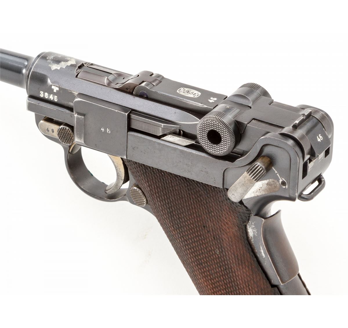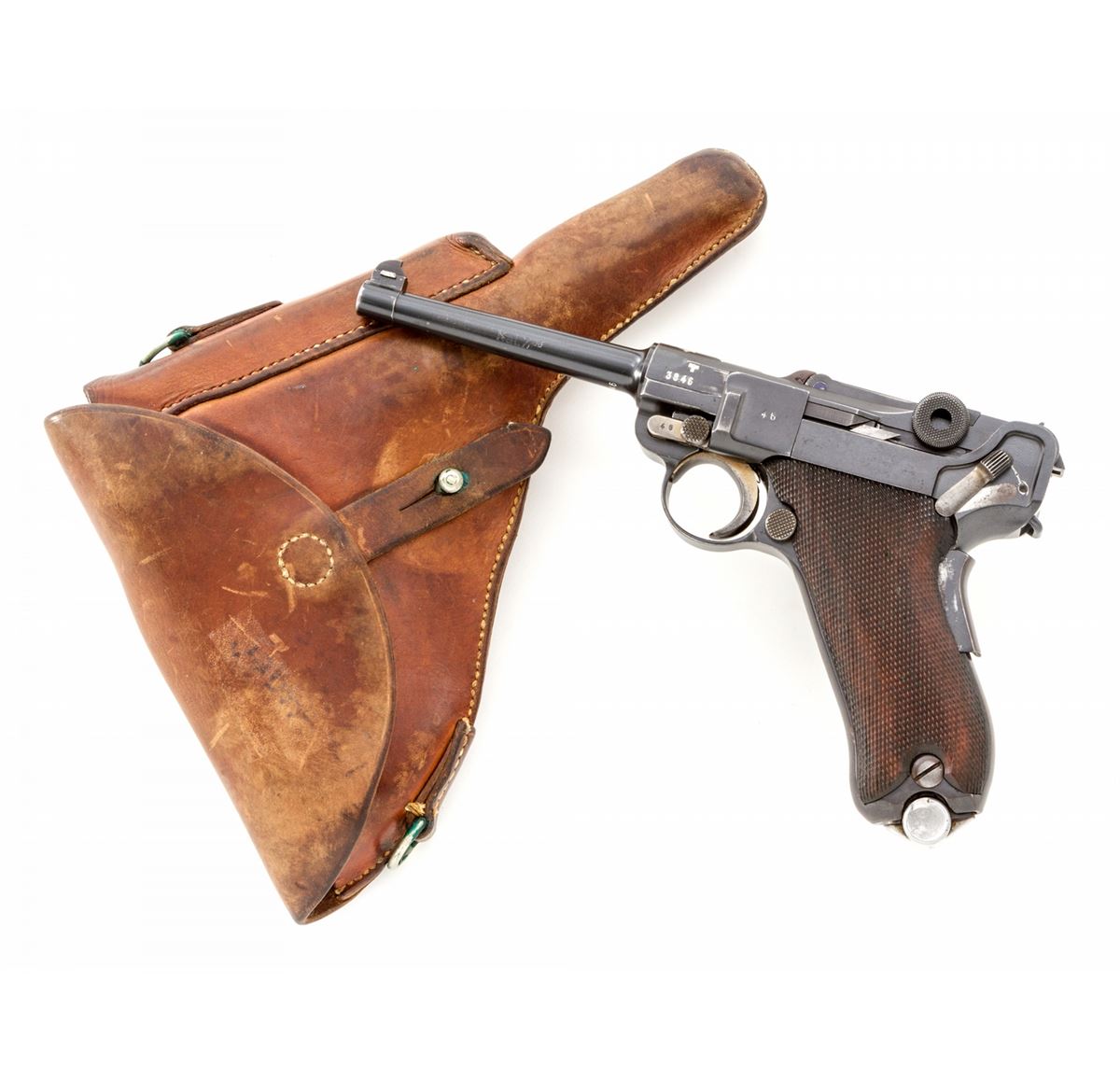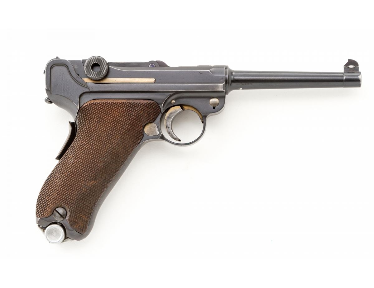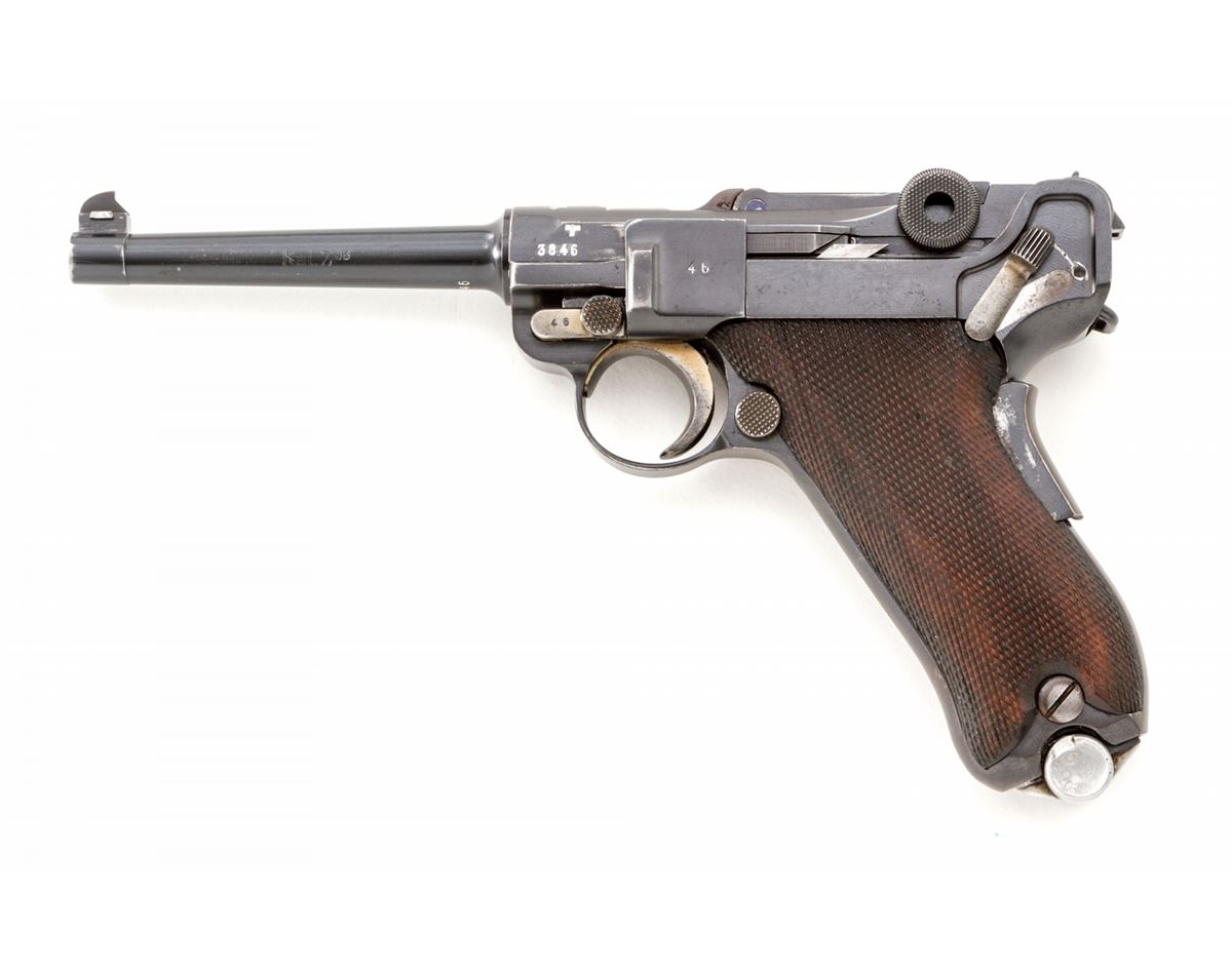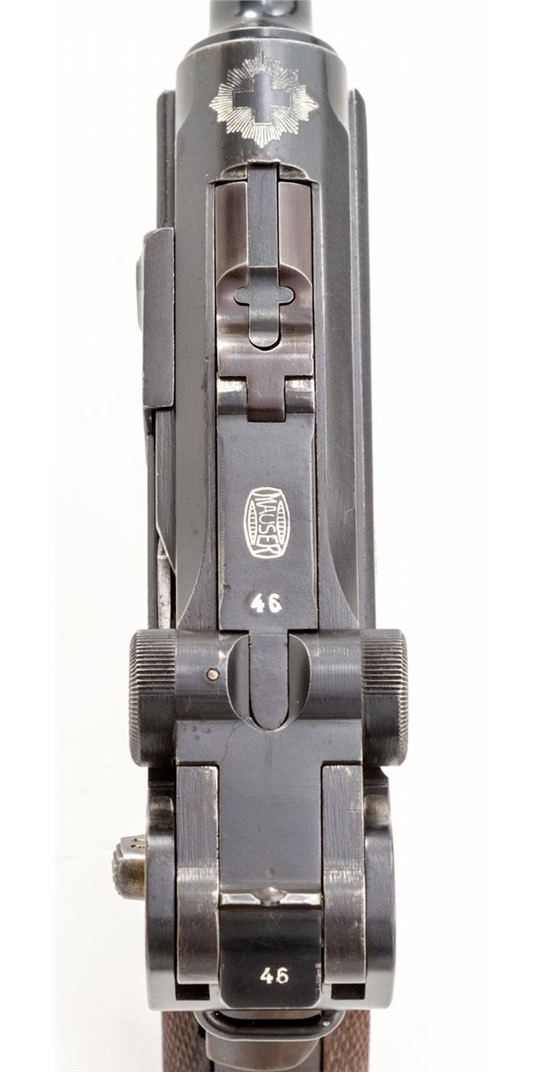 Rare 1906 Mauser Banner Swiss Grip Safety Commercial Luger, #3846v, .30 Luger cal., 4-3/4'' barrel, blue finish with straw small parts, factory checkered walnut grips, and two matching tin-plated magazines with aluminum bases. Swiss cross in sunburst to chamber area, Mauser Banner to central toggle link, lower portion of safety area is polished bright, extractor marked ''Geladen'', grip safety, no stock lug. Left side of barrel marked ''Kal. 7,65'', with ''(eagle)/N'' German commercial proofmarks. In 1937 dated leather holster. Considered extremely rare with only approx. 100 mfg'd. Condition is fine to near excellent retaining approx. 94% lightly thinning rust blue. Straw parts retain approx. 75%-80% finish. Grips with mild flattening and oil darkening. Action is crisp, bore is fine. All visible matching numbers; one magazine was later numbered to match. Holster with light oil staining and traces of previous owner's inventory markings to upper flap. Est.: $2,500-$3,500. (C&R/PPT) (John Siroonian estate)