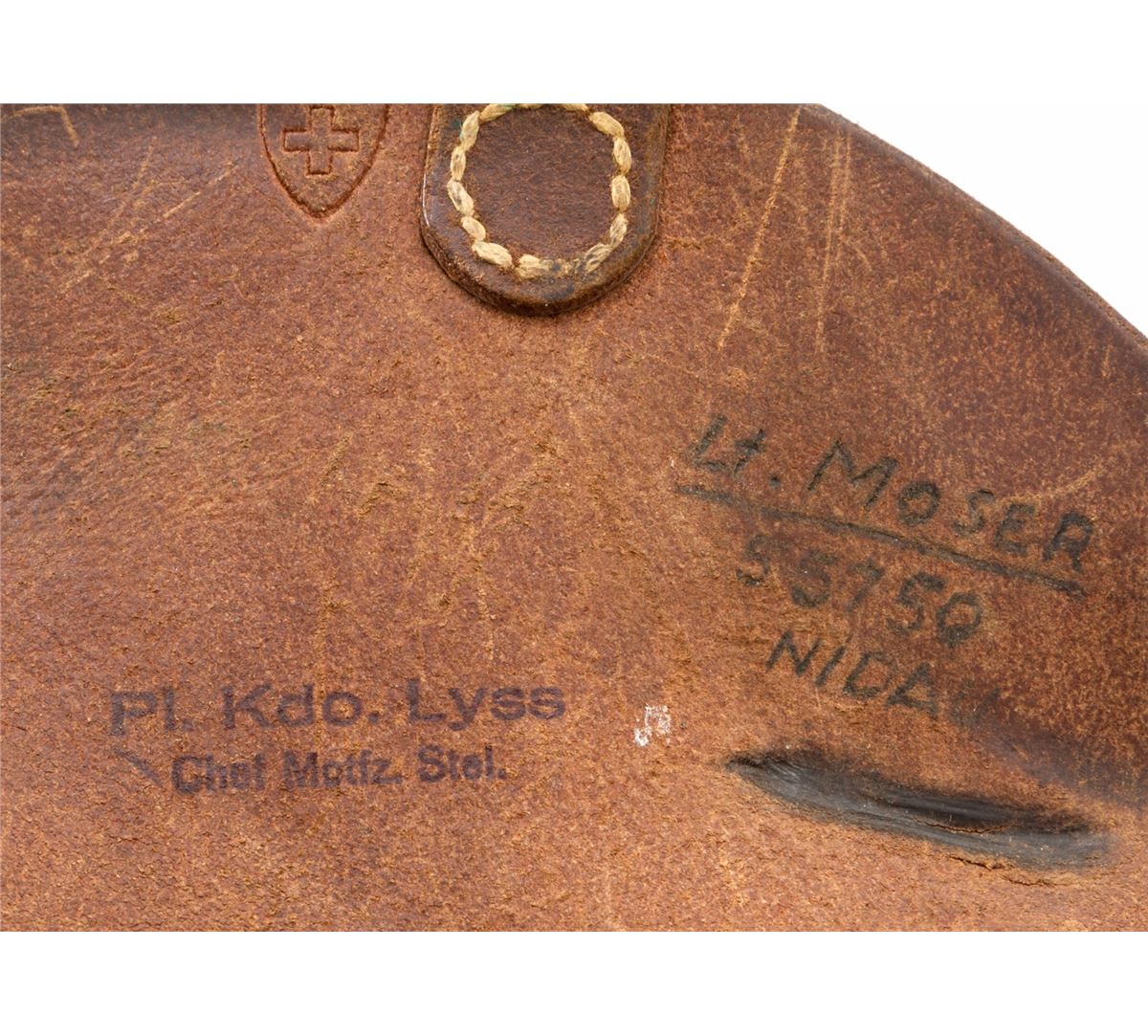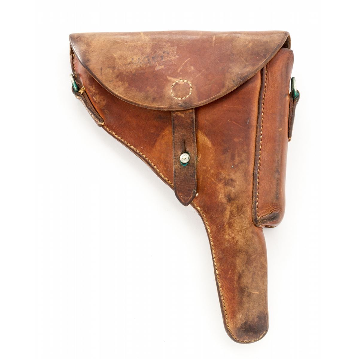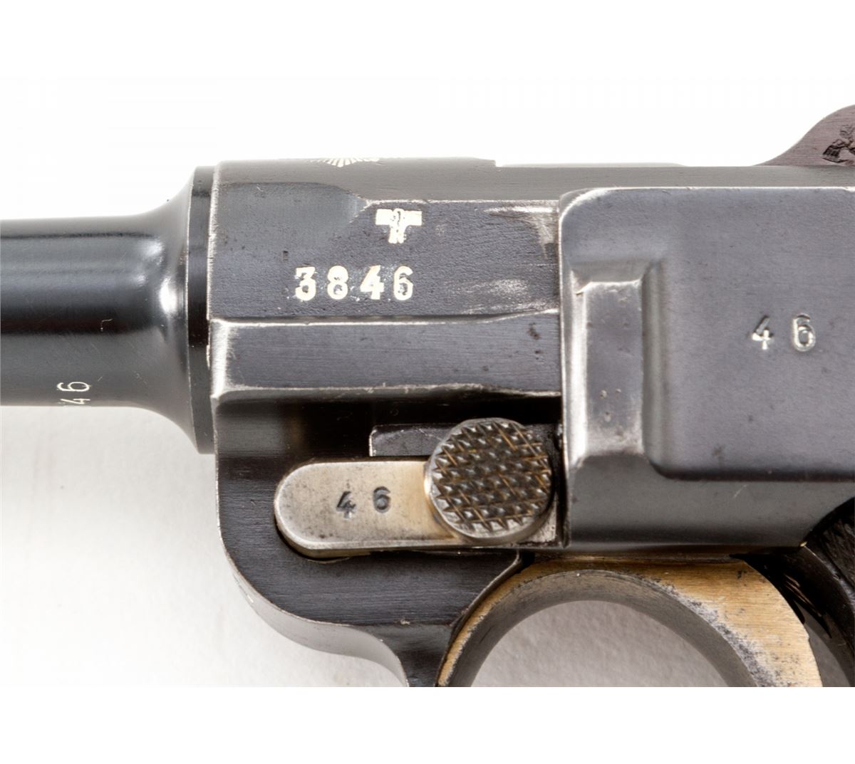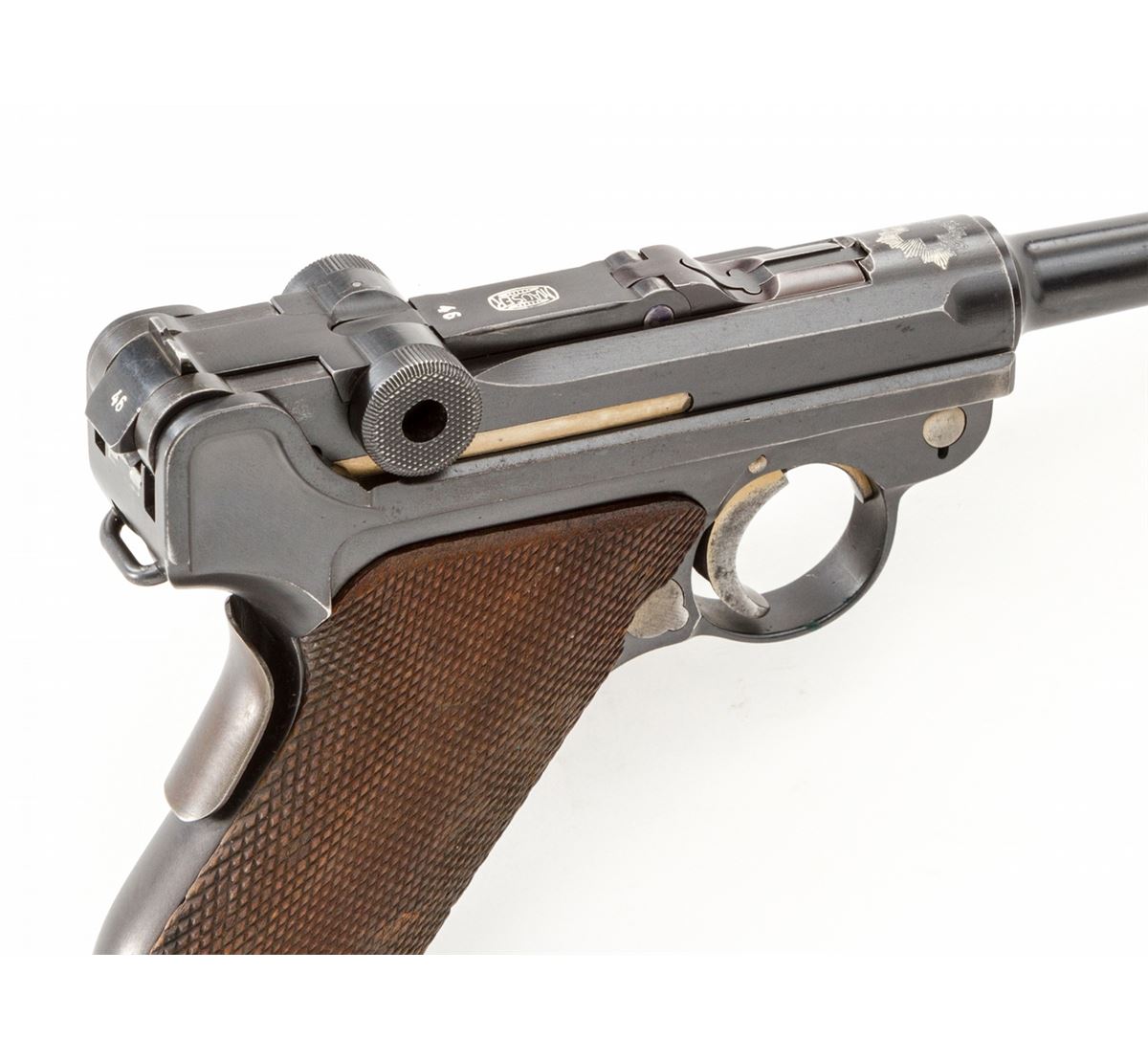 Rare 1906 Mauser Banner Swiss Grip Safety Commercial Luger, #3846v, .30 Luger cal., 4-3/4'' barrel, blue finish with straw small parts, factory checkered walnut grips, and two matching tin-plated magazines with aluminum bases. Swiss cross in sunburst to chamber area, Mauser Banner to central toggle link, lower portion of safety area is polished bright, extractor marked ''Geladen'', grip safety, no stock lug. Left side of barrel marked ''Kal. 7,65'', with ''(eagle)/N'' German commercial proofmarks. In 1937 dated leather holster. Considered extremely rare with only approx. 100 mfg'd. Condition is fine to near excellent retaining approx. 94% lightly thinning rust blue. Straw parts retain approx. 75%-80% finish. Grips with mild flattening and oil darkening. Action is crisp, bore is fine. All visible matching numbers; one magazine was later numbered to match. Holster with light oil staining and traces of previous owner's inventory markings to upper flap. Est.: $2,500-$3,500. (C&R/PPT) (John Siroonian estate)