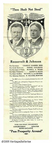 <B>Rare 1912 Roosevelt - Johnson Jugate Broadside</B></I> Jugate items of any genre for this "Bull Moose" ticket are highly prized, and a larger display item like this is especially nice. 5" x 14.5". Condition is excellent but for a couple of fine horizontal creases as made. One small, light stain mark in the field does not detract. Lot:261