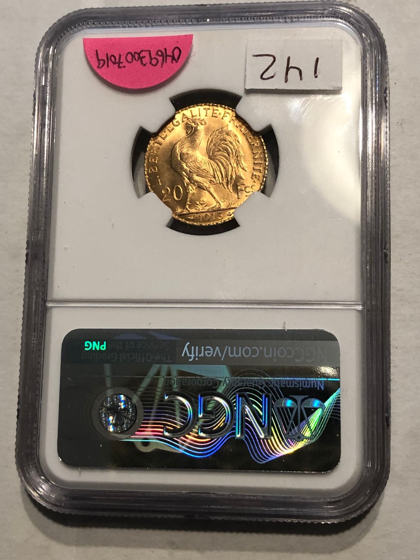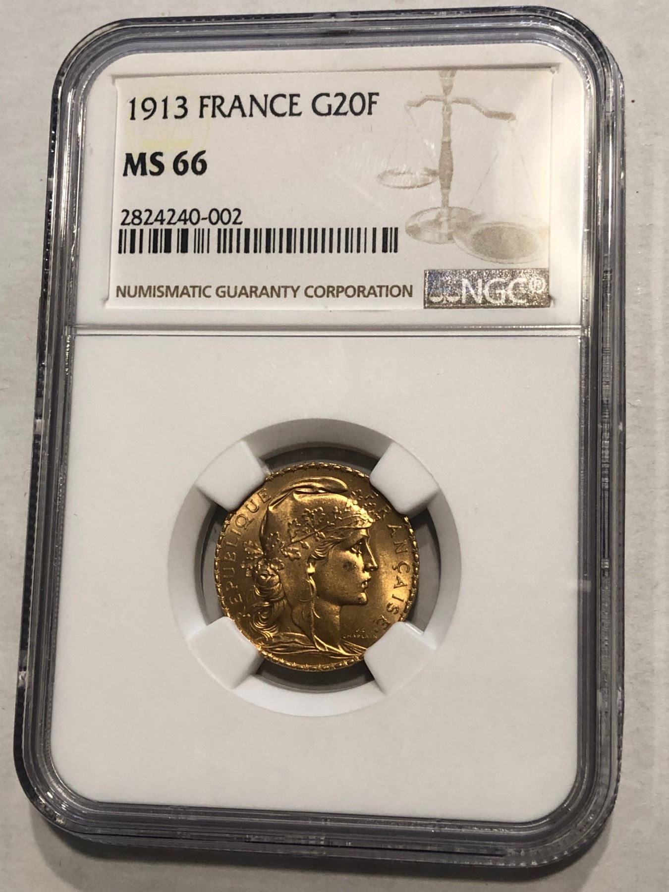 Rare 1913 France GOLD 20 Franc Rooster Certified NGC MS66 Serial Number 2824240-002