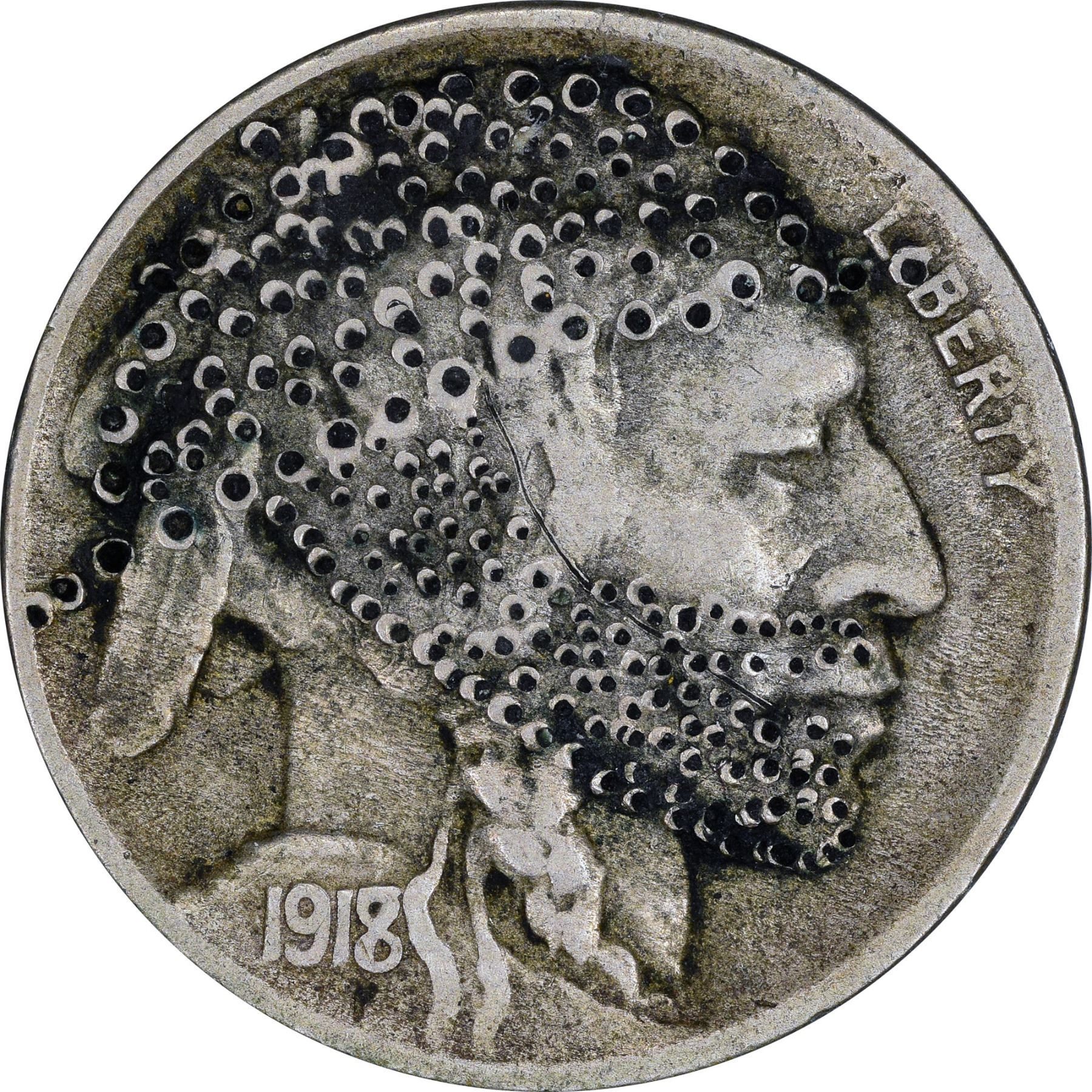 Description: This hobo nickel is well known by hobo nickel and coin collectors alike not for its art work, but for the fact that it was done on a very scarce over date nickel. A hat, hair, moustache and beard were created with a series of simple punch marks on what would have been a problem free VF coin! It was written up in BoTales Vol. 3 No. 3, 10/94 by Bill Fivaz wondering what happened to it. Here it is! Despite the use of this basic technique, the rarity of this nickel in this grade makes it a very desirable addition to any collector who wants something out of the ordinary as the center piece of his or her collection. (Total: 1 coin)