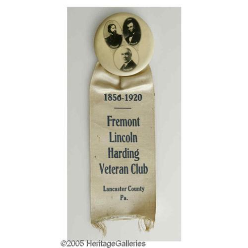 <B>Rare 1920 Warren Harding Trigate Button.</B></I> This large 2 1/8" button was issued to honor those few survivors from the earliest days of the Republican Party's founding, and is one of the more appealing varieties for this generally tough candidate. Button is excellent, while ribbon shows a little trivial "aging."