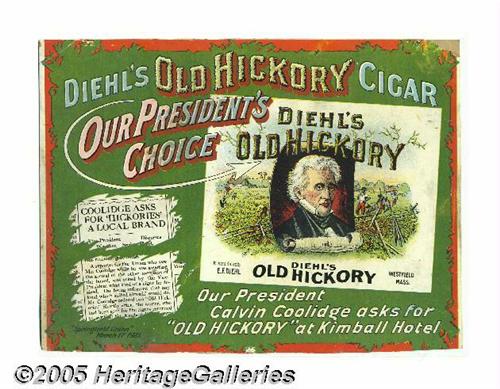 <B>Rare 1920s Cardboard Advertising Sign With Calvin Coolidge Endorsement</B></I> We have never seen this colorful sign before. Trimmed at top and bottom and wear at upper right hand corner, but otherwise very good condition. Would command a much higher estimate in top shape, but still very display worthy as is. From the Larry Krug Collection. 14 x 10". Lot:252