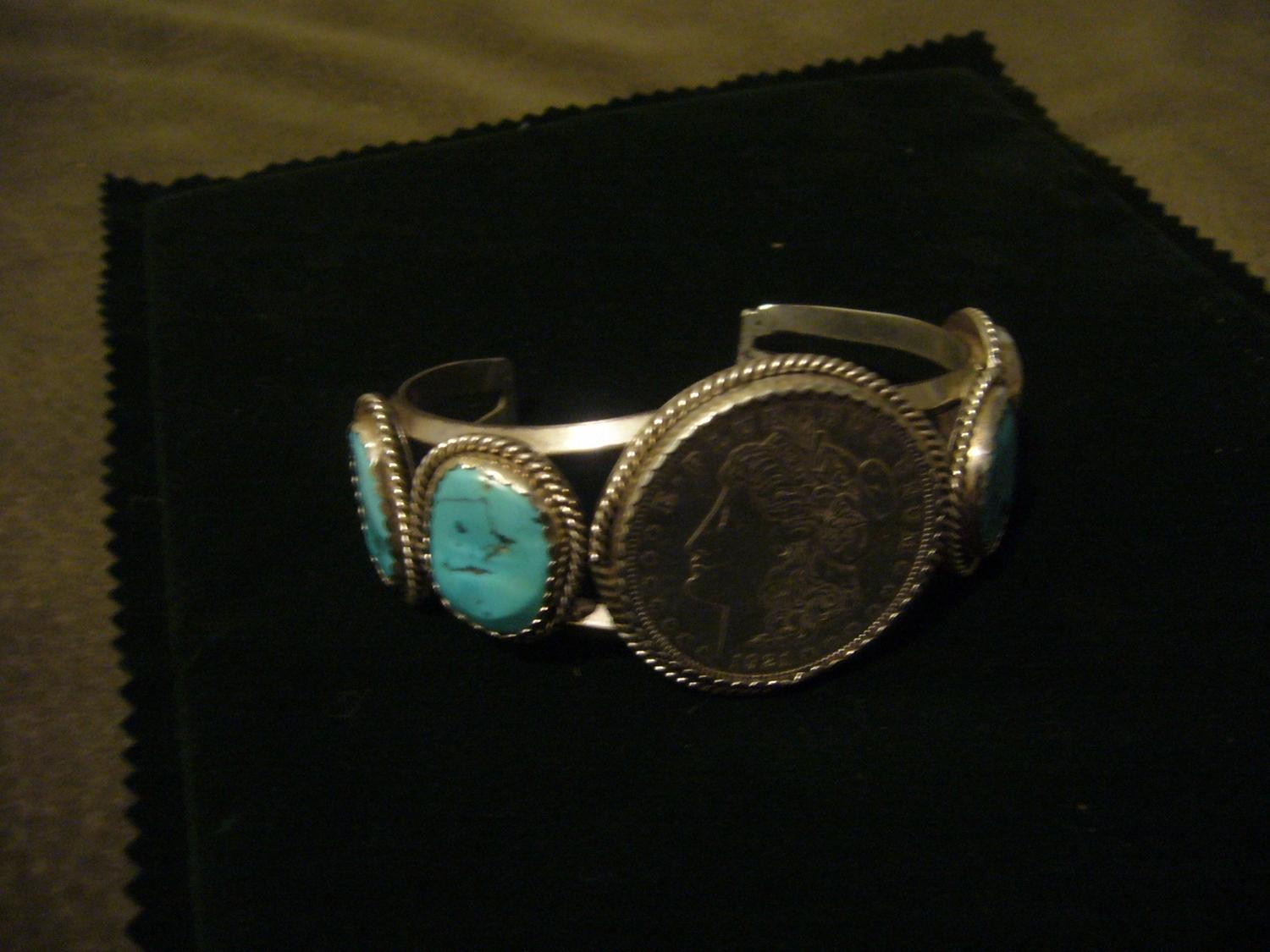 rare 1921 morgan dollar and 4 large turquoise sterling bracelet