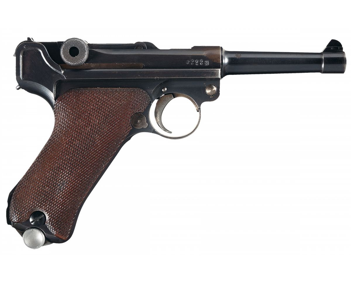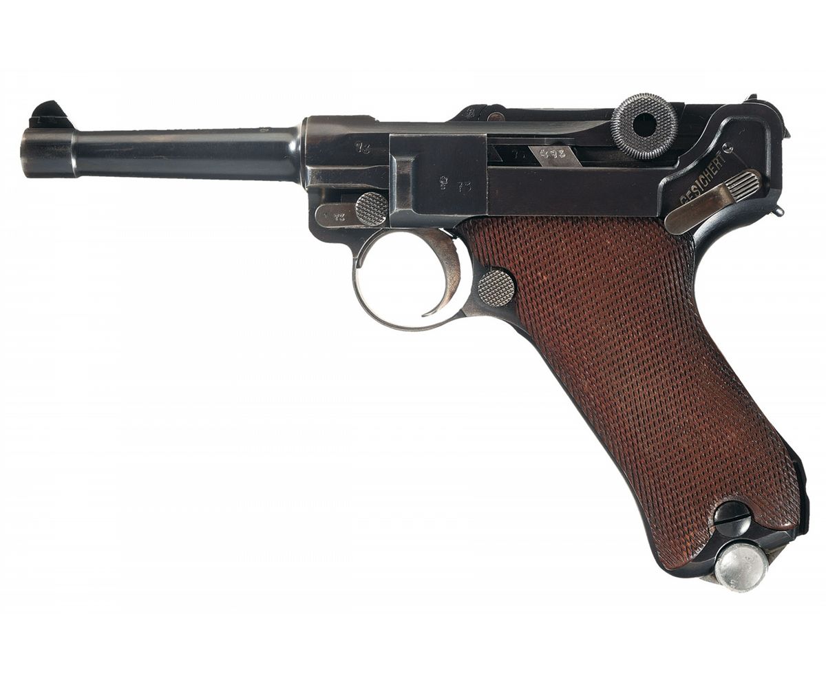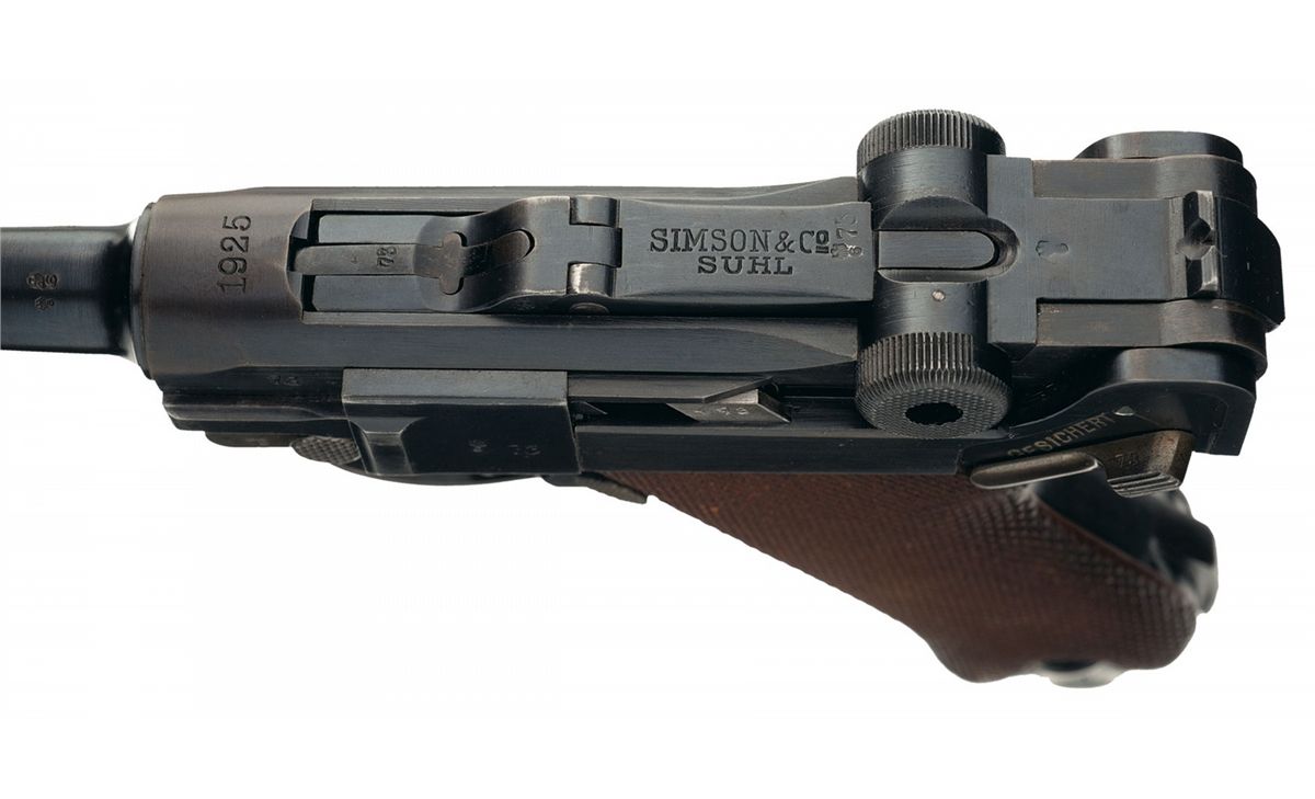 This is an extremely rare and excellent example of a Weimar era 1925 dated Simson & Co. Suhl Luger pistol, serial number "73". They were issued to both the Weimar Military and Police units up through the late 1920s before Hitler came into power and abolished/closed the Simson Company. The top of the chamber is dated 1925 and the front toggle is marked: "SIMSON & Co./SUHL". The right side of the barrel extension has several small "Eagle 6" acceptance/firing proofs along with the small Weimar Eagle acceptance proof. It has the military style serial number placement with the full serial number on the major components with the last two digits on the small parts with the "Eagle/6" Simson acceptance proof on many if not all of the small parts. It has the standard "GESICHERT" and "GELADEN" safety and extractor markings. It is fitted with standard checkered walnut grips. It is also complete with a renumbered matching magazine that has the nickel plated magazine body with the aluminum base marked "73", an original early Police style Luger holster that is marked on the front: "Early Weimar Eagle/WaA78" over "C. Pose A.G./Berlin/1926". This holster is the scarce pattern that has the additional flap over the takedown tool pouch and slot for the small pin-punch.