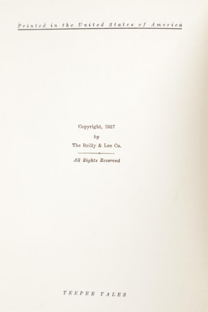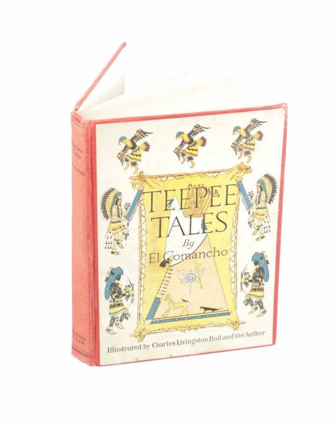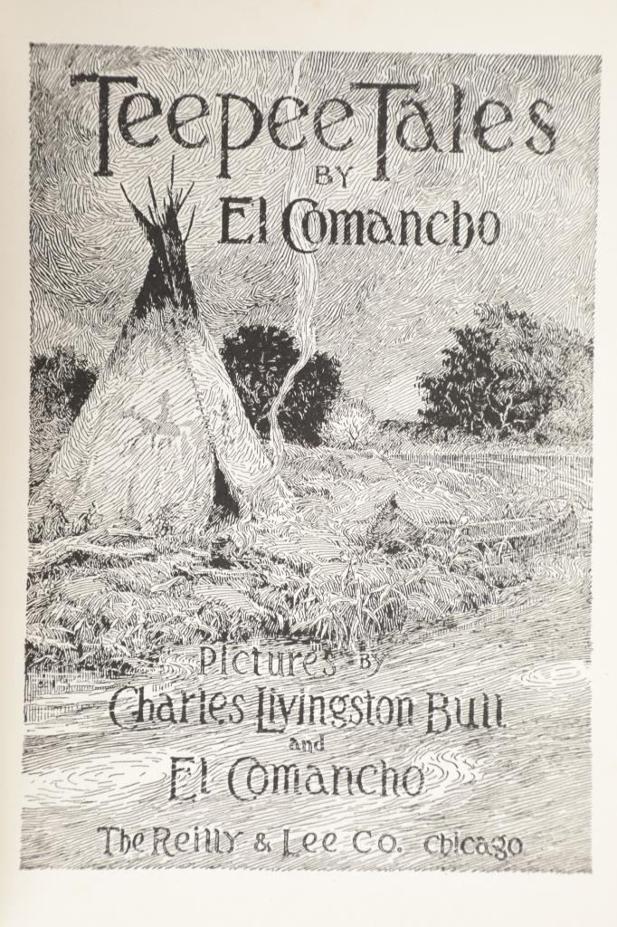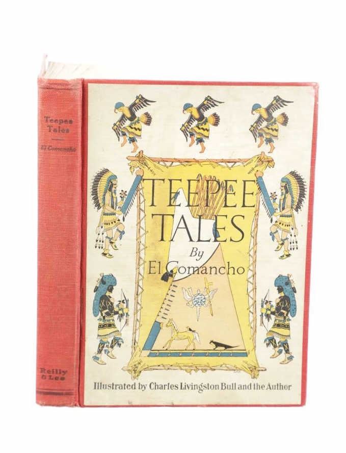 Featured in this lot is a First Edition of "Teepee Tales" by El Comancho (Walter Shelley Phillips), 1927. Published by The Reilly & Lee Co and illustrated throughout with black line drawings by Charles Livingston Bull and the Author. A wonderful anthology of Northwest Coast and Plains Indian legends, drawing upon the author's widely syndicated column "Teepee Tales" featuring illustrations by Charles Livingston Bull, the noted wildlife artist who had contributed to Jack London's Call of the Wild. Phillips (1867-1940) details in his introduction how these tales were drawn from the legends and folklore of the Salish, Siwash, Blackfeet, Rosebud Sioux, and Oglala Sioux. As popular writer, lecturer, artist, and naturalist, Phillips traveled extensively across the West, and switched between homes in Seattle and Chicago. Walter Shelley Phillips (1867-1940), best known by his pen name "El Comancho", was a popular Western writer, artist, and lecturer. A self-educated and self-trained naturalist, artist, geologist, newspaper reporter, freelance writer and author of numerous books. During his years as a game hunter for the expanding railroads, Phillips developed relationships with Plains Indians tribes, and these early experiences became the basis for a long career spent re-telling tribal stories, legends, and ways of life for readers and audiences around the country. The red cloth bound colour printed illustrated hardcover is in nice condition, slight scuffing to edges. Intact pages exhibit age tanning and slight foxing, measures 6.25"W x 8.75"L x 1"D, weight 1lb, 2oz.