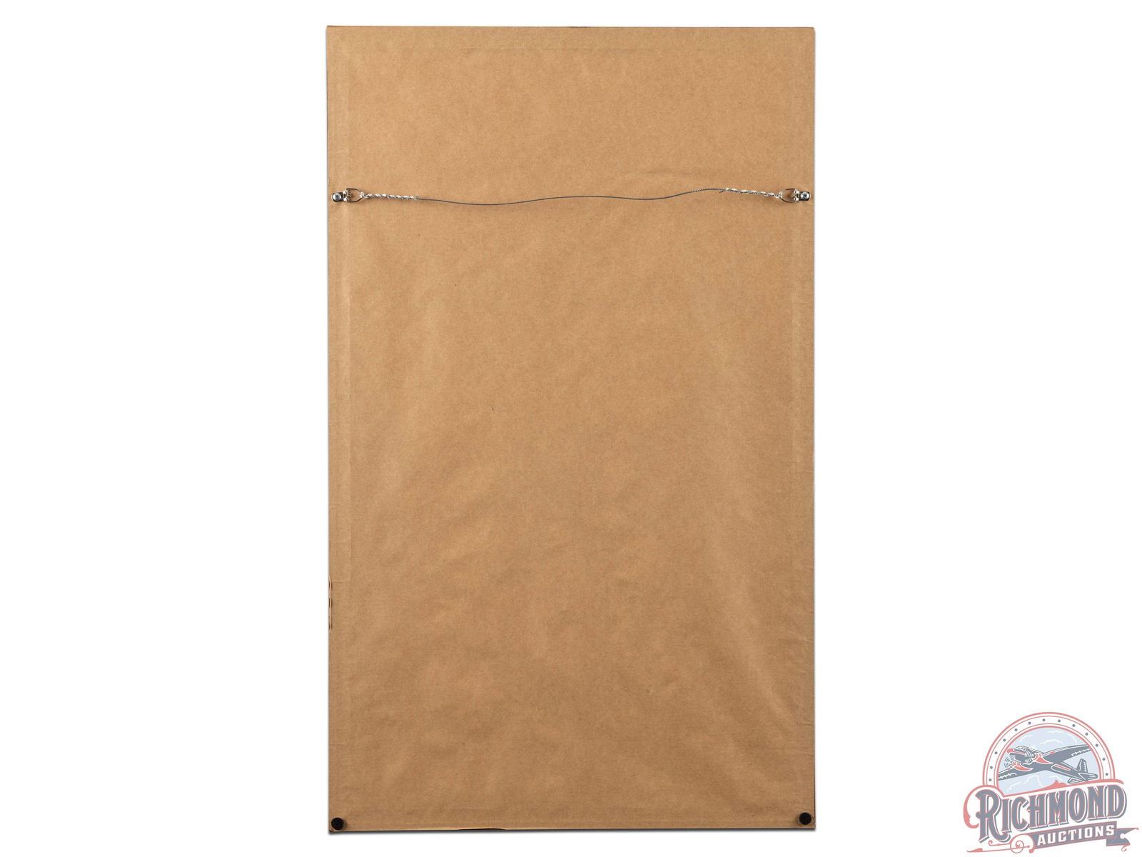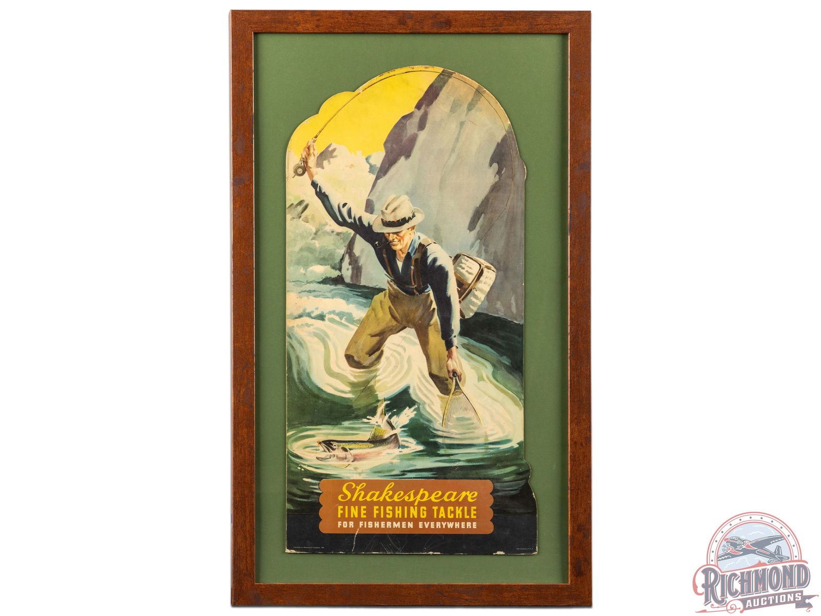 Circa 1930's. Rare and original Shakespeare cardboard easel back display with excellent graphics, featuring a pipe smoking fly fisherman landing an exceptional rainbow trout. This is the only example we have seen. Exhibits with good color and typical age and storage marks. The edges show small areas of discoloration and wear, with more wear along the top and bottom edges. Professionally framed and behind glass. Sign measures 27" H x 14" W. Marked Copyright by Shakespeare Company 1936, Lithographed in USA. 33" H x 20" W.