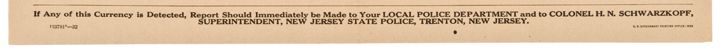 This large Broadside is printed in black upon light tan period paper. It has a complete listing of the Serial Numbers on the Currency used to pay the Ransom for the Recovery of the Lindbergh's Baby. Issued by the U.S. Government Printing Office in 1932. The Broadside lists all of the $5, $10, and $20 notes by serial number. The main contact person, should any of this currency be discovered was Colonel H. N. Schwarzkopf, Superintendent of the New Jersey State Police (whose son is General Norman Schwarzkopf of "Desert Storm" fame). Folded as mailed (no envelope) having premium quality for this large item. A classic and important piece of historical Prints and Criminal Americana, also associated with early Small Size Currency issues paid in Ransom. This remarkable example will look superb properly framed on display.