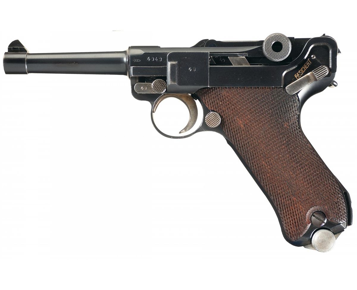 Very fine with 90% of the slightly faded blued finish overall with edge and high spot wear. The small parts retain 40% of their original straw colors overall. The grips are in near excellent condition with nice distinct checkering on both sides, showing some minor nicks/chips in the tops of the checkering. An extremely scarce Mauser Banner contract Luger pistol, with all matching numbers to include the magazine.