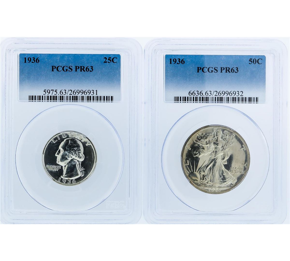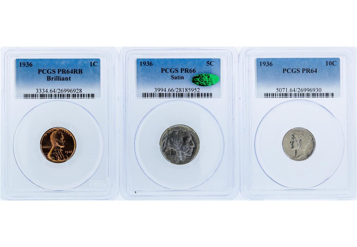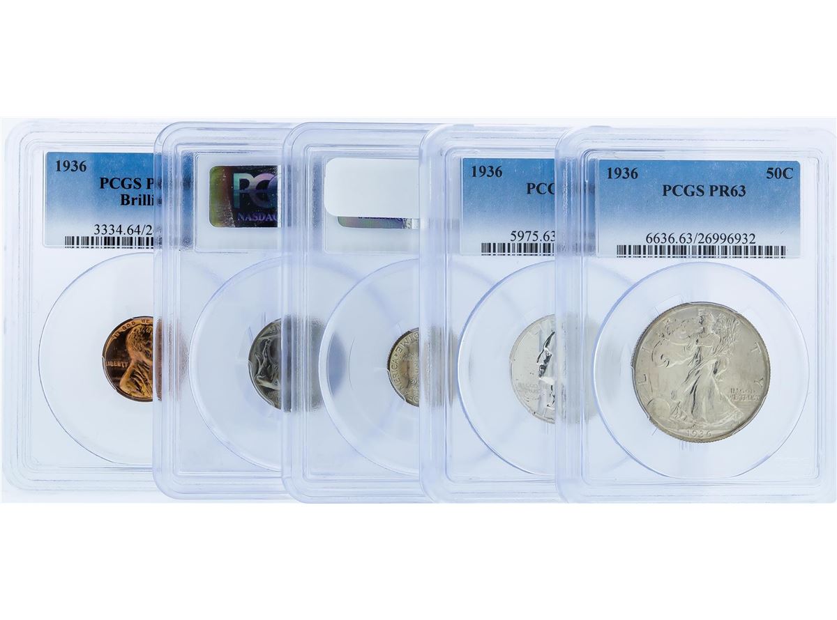 This Rare 1936 PCGS Graded (5) Coin Proof Set includes the following coins: 1936 Lincoln Cent PCGS Graded PR64RB Brilliant coin, 1936 Buffalo Nickel PCGS and CAC Graded PR66 Satin, 1936 Mercury Dime PCGS Graded PR64, 1936 Washington Quarter PCGS Graded PR63, 1936 Liberty Walking Half Dollar PCGS Graded PR63. These are very sought after coins and is a great addition to any collection. PCGS Graded.
