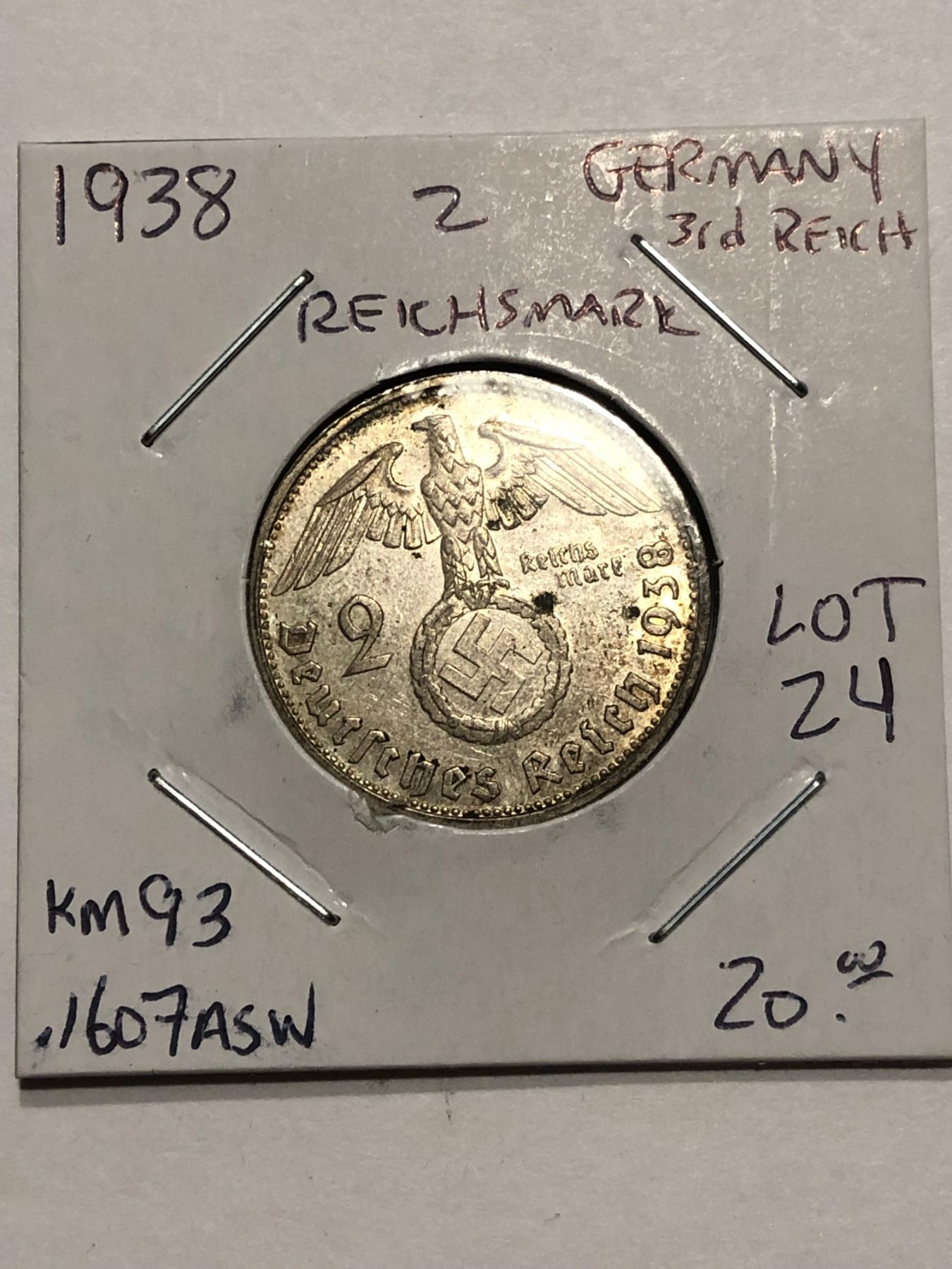 Rare 1938 Silver Germany 3rd Reich 2 Reichsmark .1607 ASW Book Number KM 93