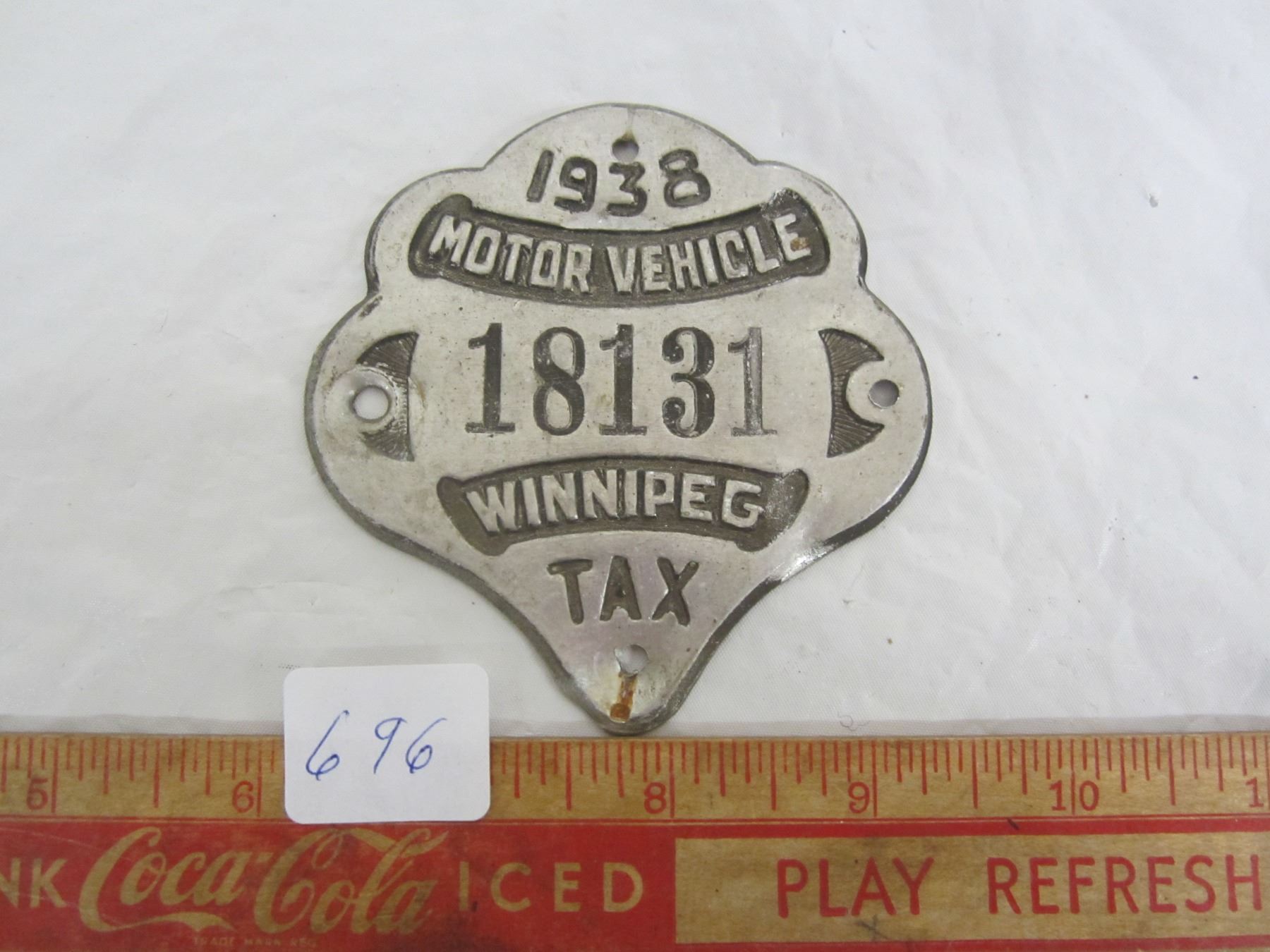 Rare 1938 Winnipeg Metal Vehicle Tax Plate