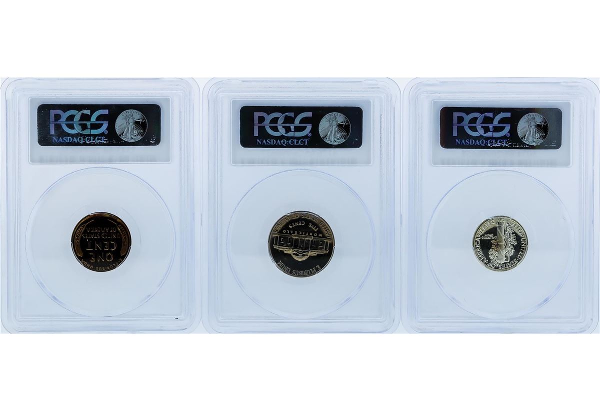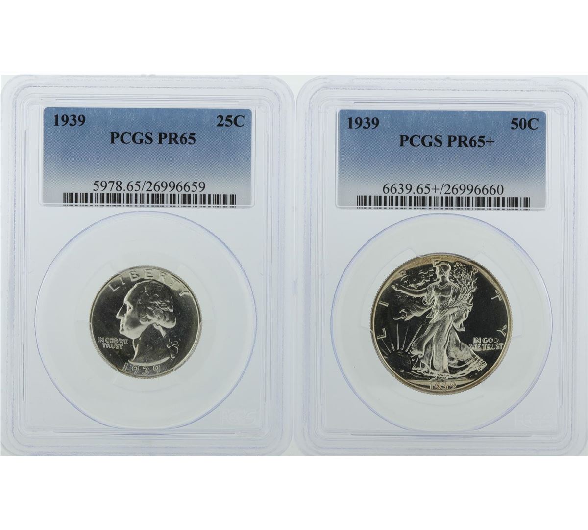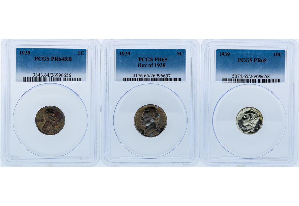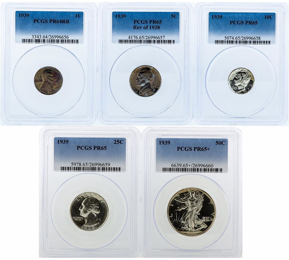 This 1939 PCGS Graded (5) Coin Proof Set includes the following coins: 1939 Lincoln Cent PCGS Graded PR64RB coin, 1939 Jefferson Nickel PCGS Graded PR65 Rev of 1938, 1939 Mercury Dime PCGS Graded PR65, 1939 Washington Quarter PCGS Graded PR65, 1939 Liberty Walking Half Dollar PCGS Graded PR65+. These are very sought after coins and is a great addition to any collection. PCGS Graded.