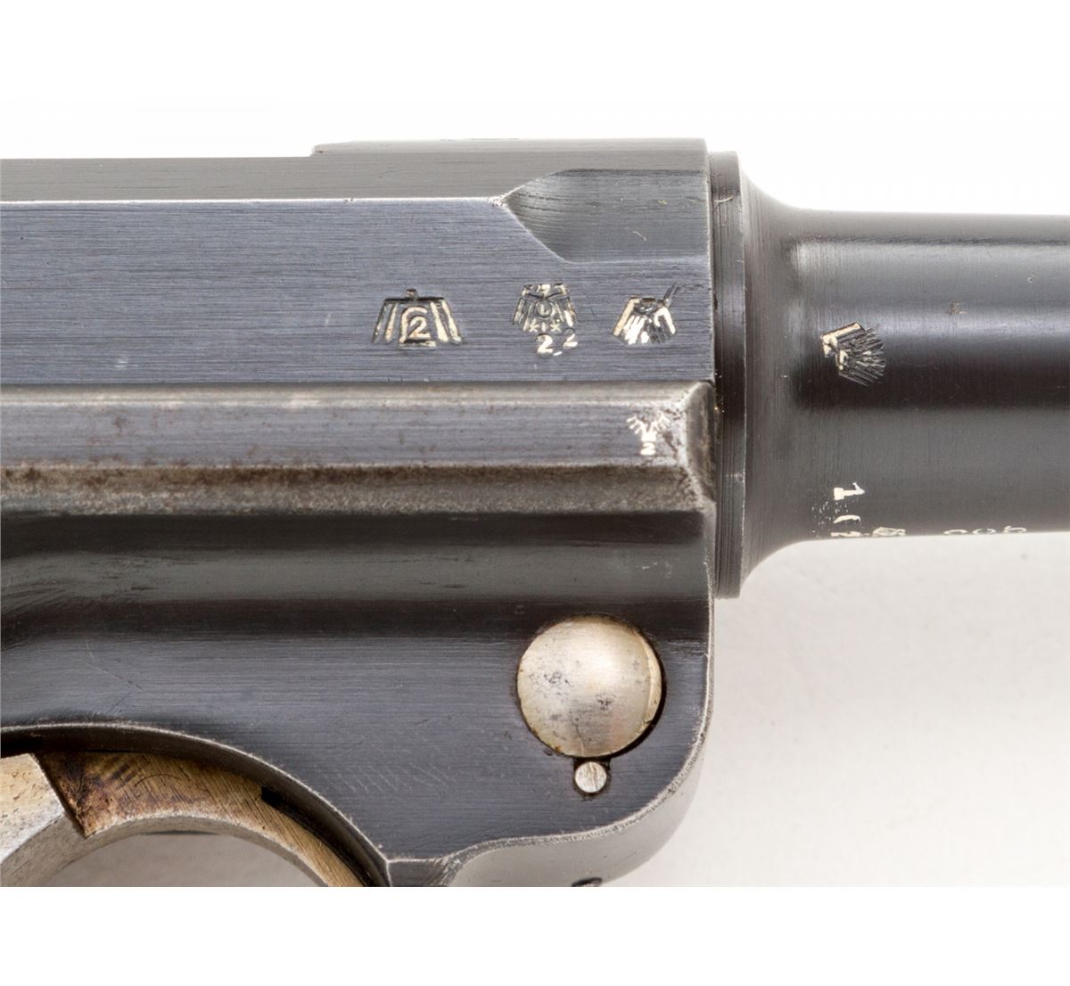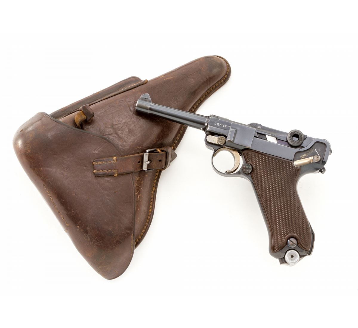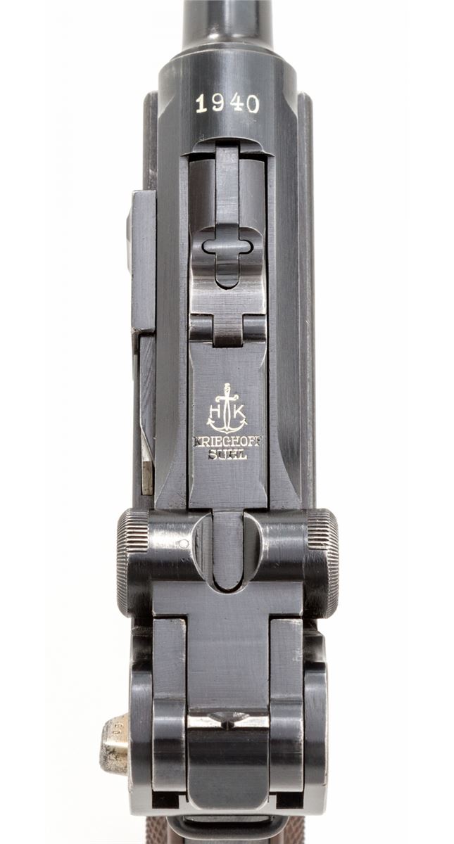 Rare 1940 Dated Krieghoff Luger, #10260, 9mm, 4'' barrel, salt blue finish with straw small parts, factory molded brown checkered plastic grips with smooth border, and two matching numbered blue-bodied extruded magazines with pinned aluminum bases. Chamber dated 1940, standard Krieghoff anchor to central toggle, ''Gesichert/Geladen'' marked thumb safety and extractor, with full complement of Luftwaffe component and inspection markings. In 1940 dated brown leather holster. Considered rare with only 1100 mfg'd. Condition is excellent retaining approx. 98% original lightly toning blue. Grips and action are crisp, bore is bright. Holster with tight stitching and light scuffs and scratches. Est.: $5,000-$7,500. (C&R/PPT) (John Siroonian estate)