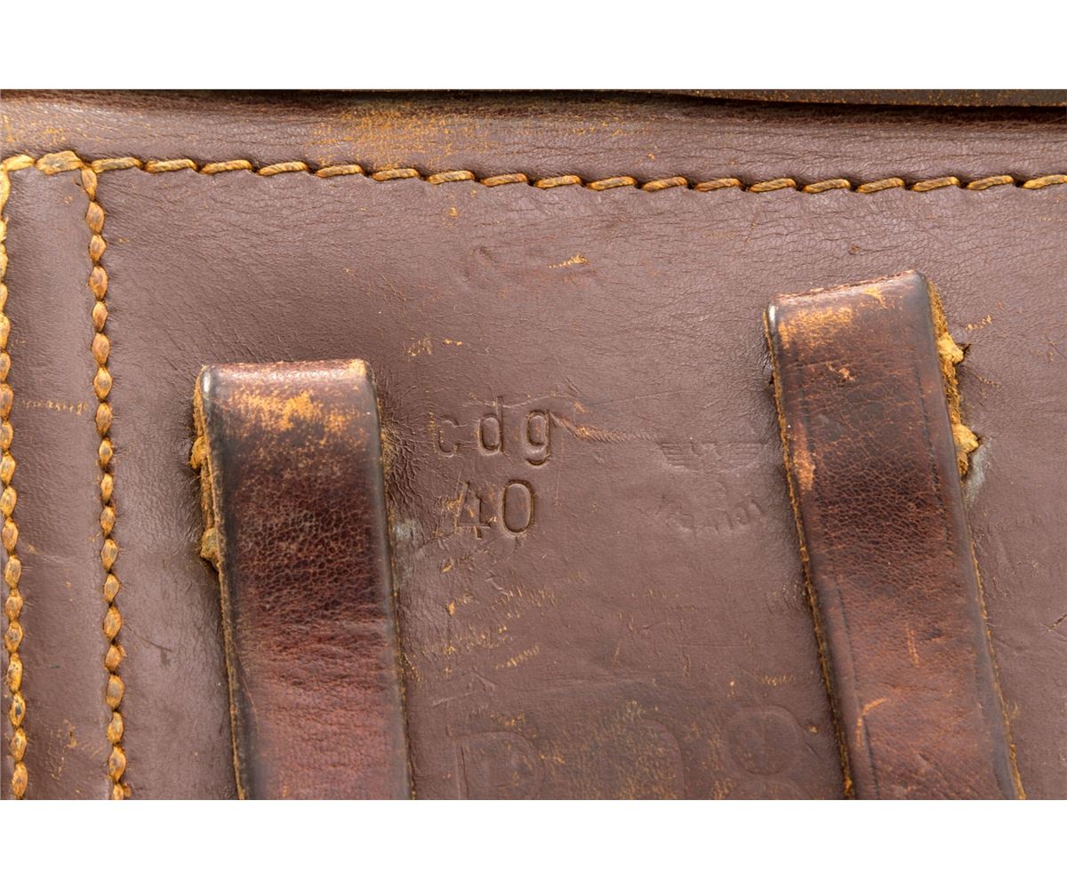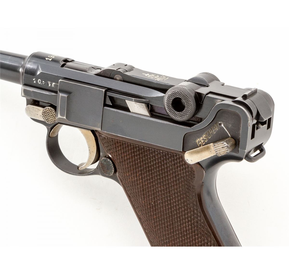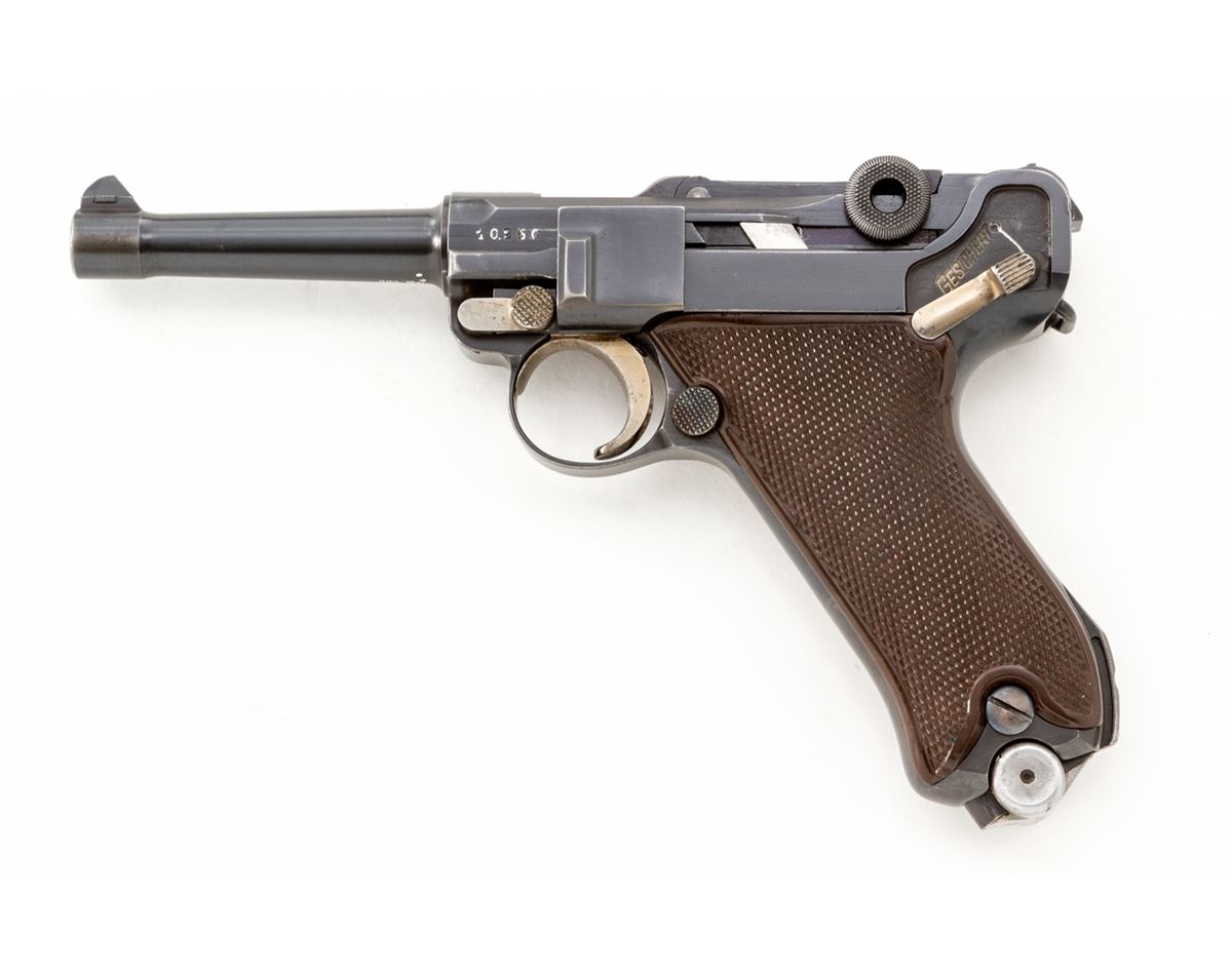 Rare 1940 Dated Krieghoff Luger, #10260, 9mm, 4'' barrel, salt blue finish with straw small parts, factory molded brown checkered plastic grips with smooth border, and two matching numbered blue-bodied extruded magazines with pinned aluminum bases. Chamber dated 1940, standard Krieghoff anchor to central toggle, ''Gesichert/Geladen'' marked thumb safety and extractor, with full complement of Luftwaffe component and inspection markings. In 1940 dated brown leather holster. Considered rare with only 1100 mfg'd. Condition is excellent retaining approx. 98% original lightly toning blue. Grips and action are crisp, bore is bright. Holster with tight stitching and light scuffs and scratches. Est.: $5,000-$7,500. (C&R/PPT) (John Siroonian estate)