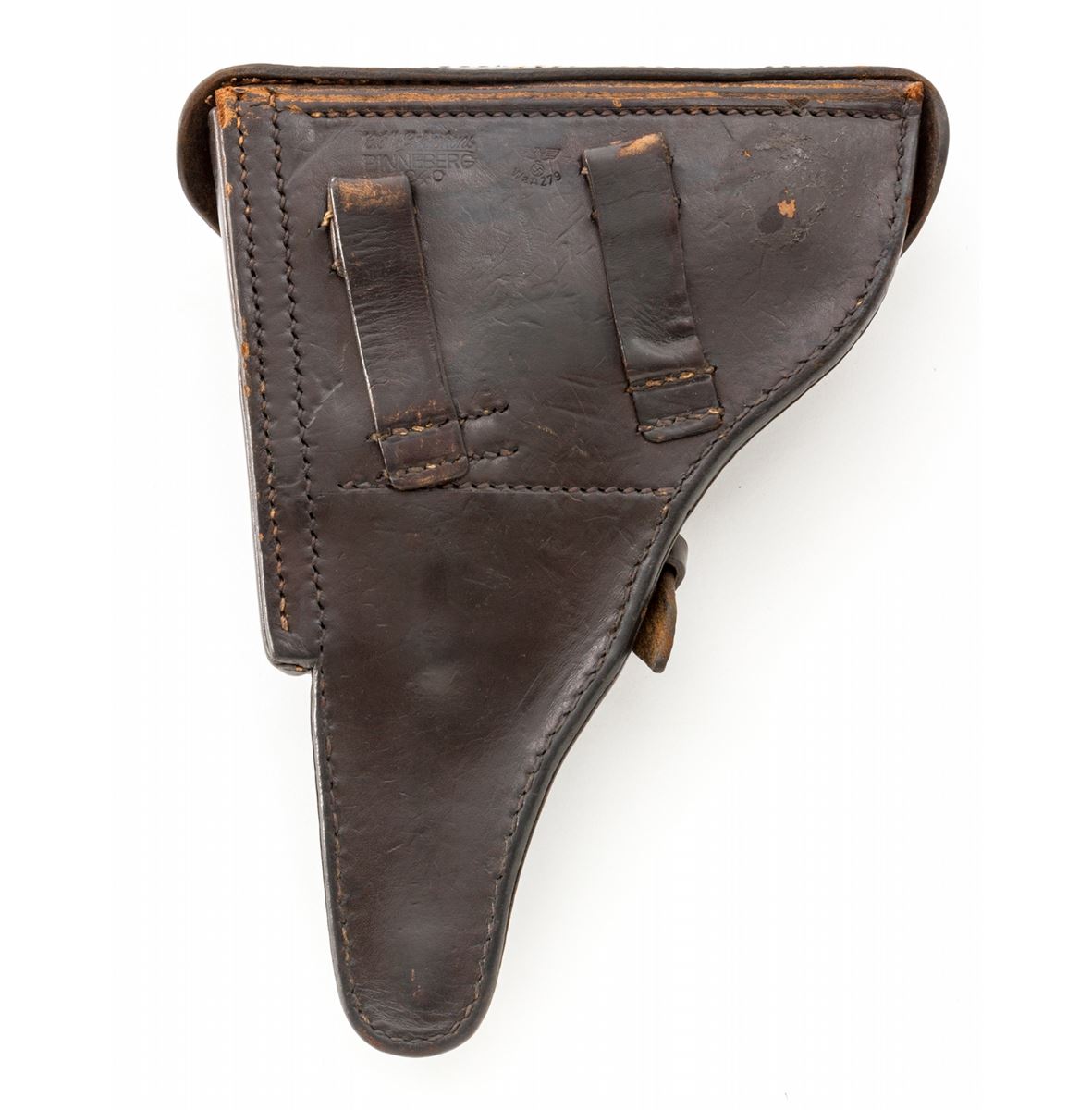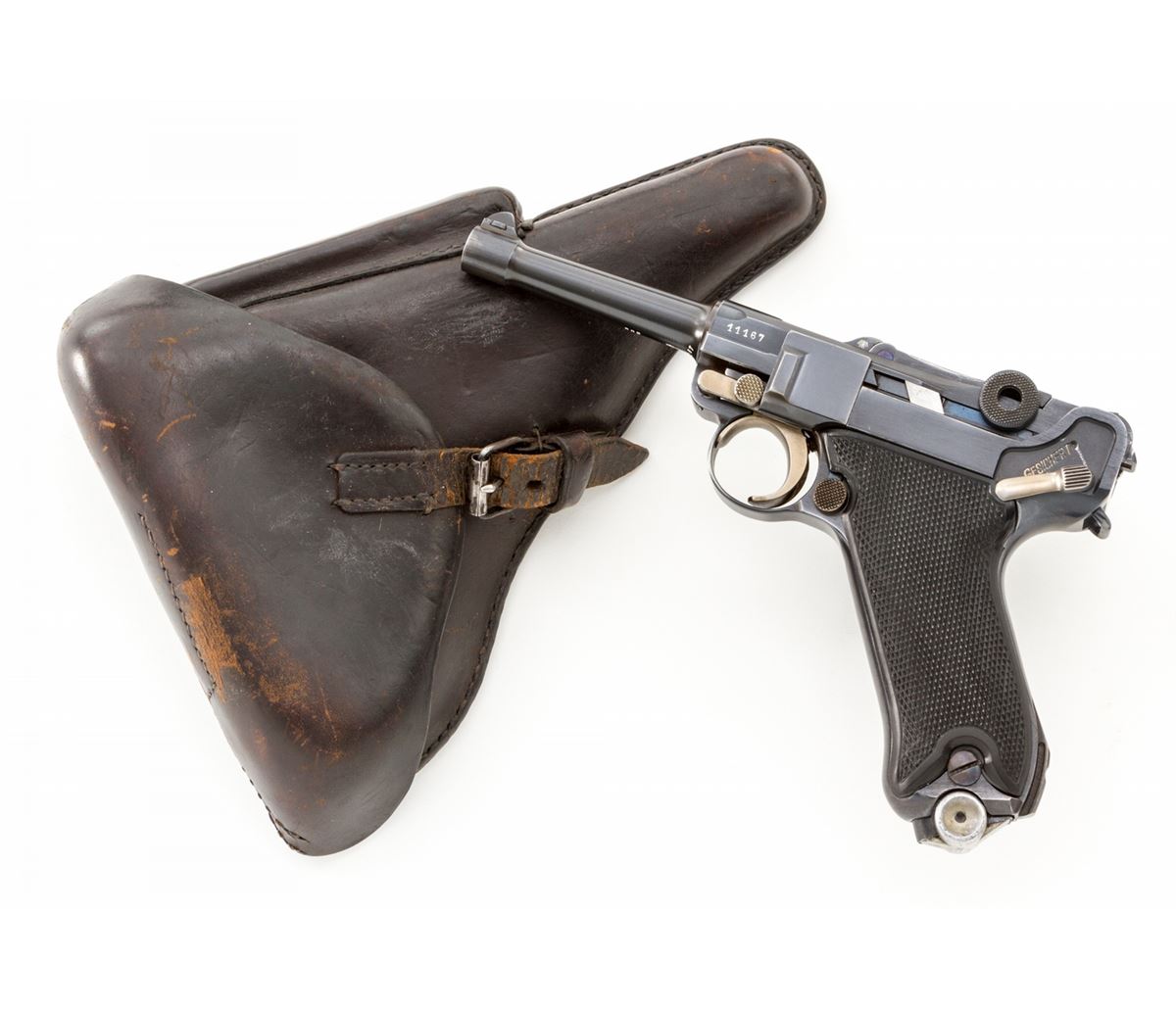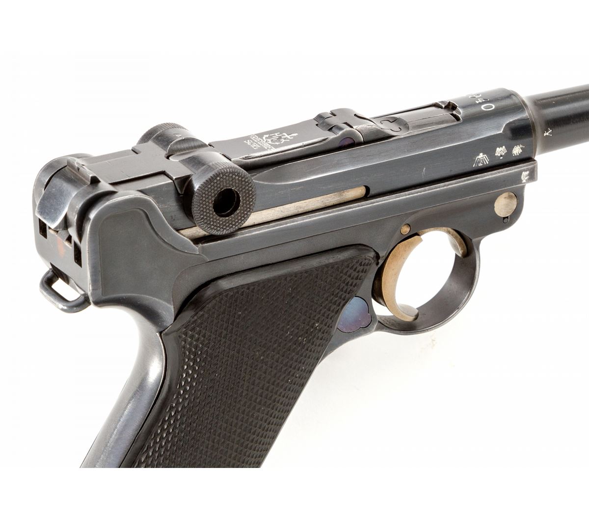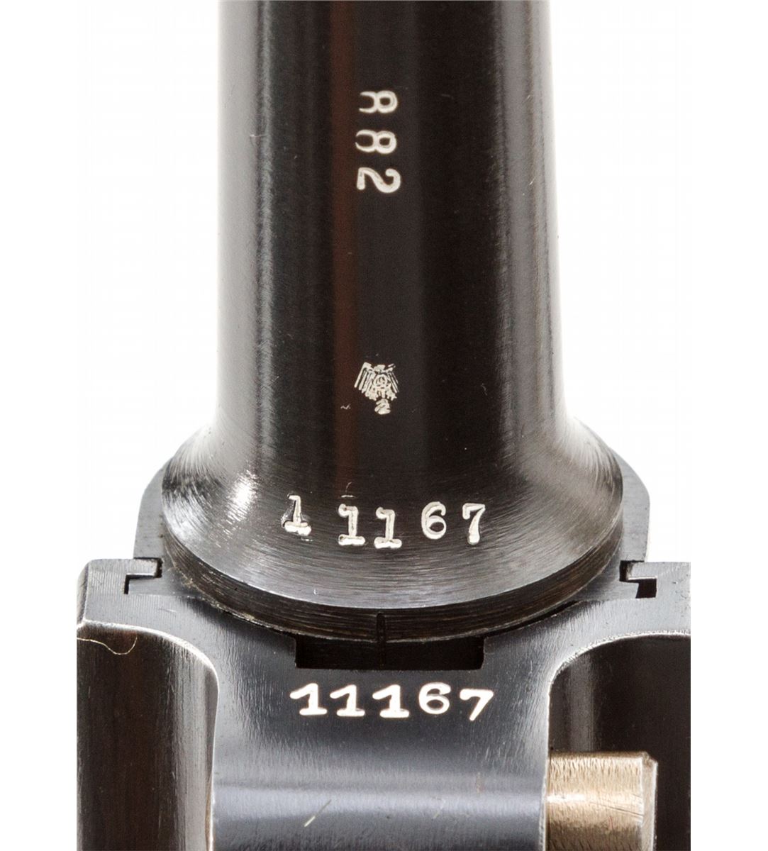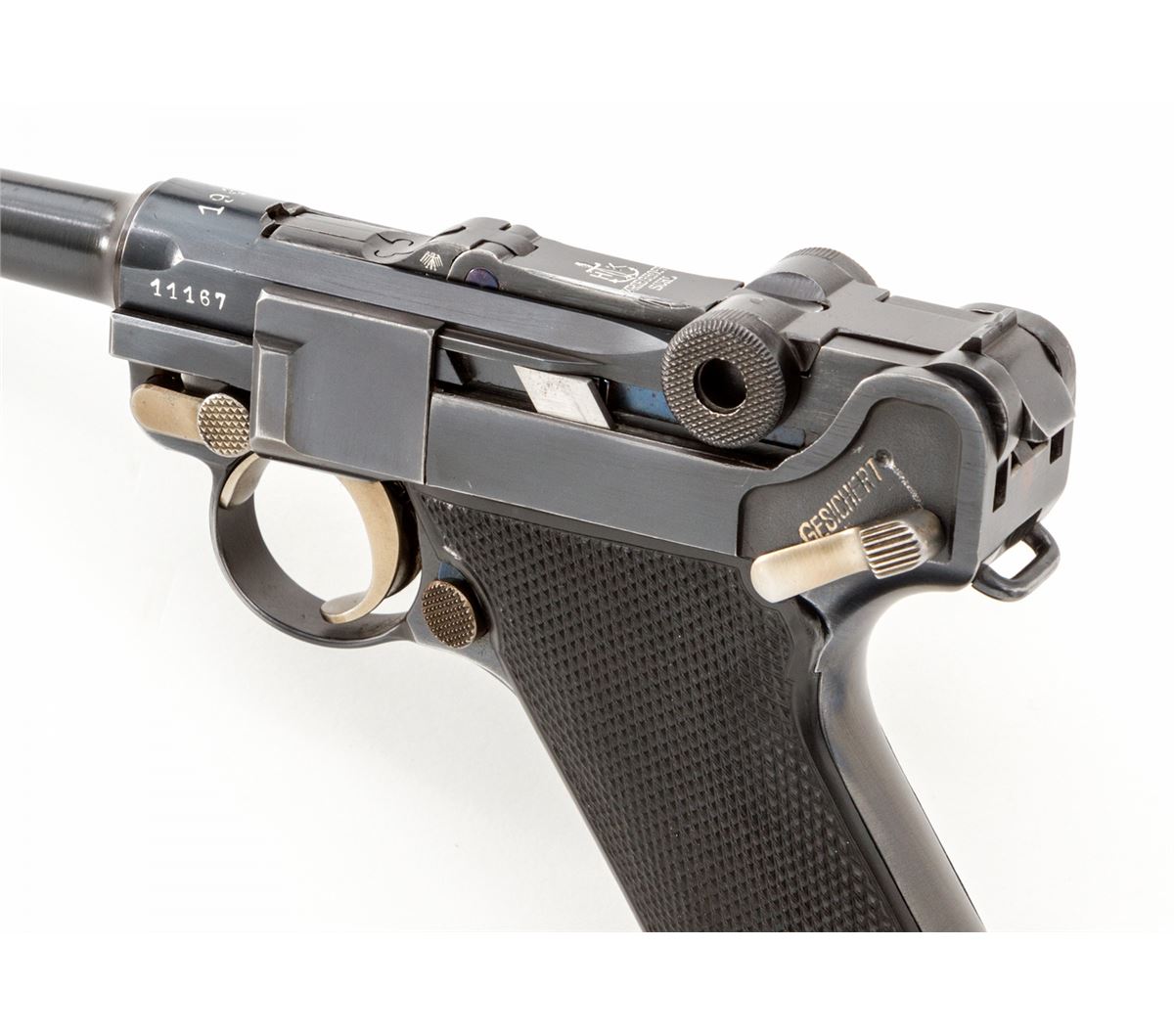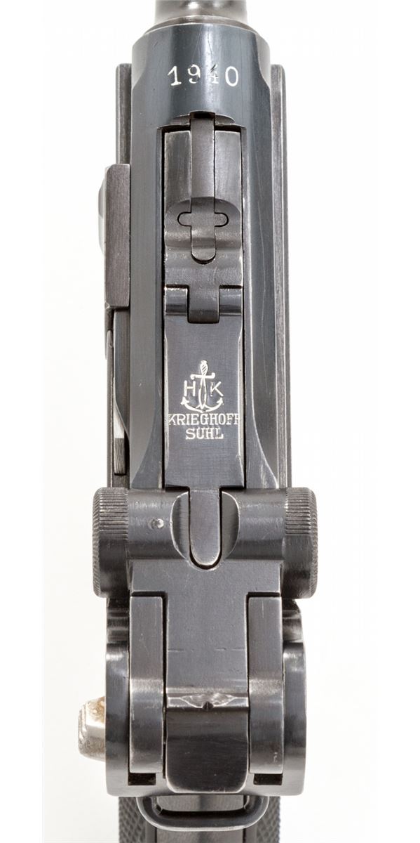Rare 1940 Dated Krieghoff Luger, #11167, 9mm, 4'' barrel, salt blue finish with straw small parts, factory molded black checkered plastic grips with smooth border, and two matching numbered blue-bodied extruded magazines with pinned aluminum bases. Chamber dated 1940, standard Krieghoff anchor to central toggle, ''Gesichert/Geladen'' marked thumb safety and extractor, with full complement of Luftwaffe component and inspection markings. In 1940 dated brown leather holster. Considered rare with only 1100 mfg'd. Condition is excellent retaining approx. 98% original lightly toning blue. Grips and action are crisp, bore is bright. Holster with tight stitching and light scuffs and scratches. Est.: $5,000-$7,500. (C&R/PPT) (John Siroonian estate)