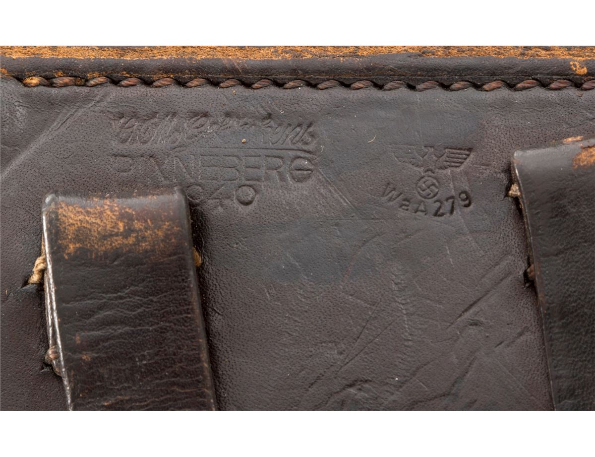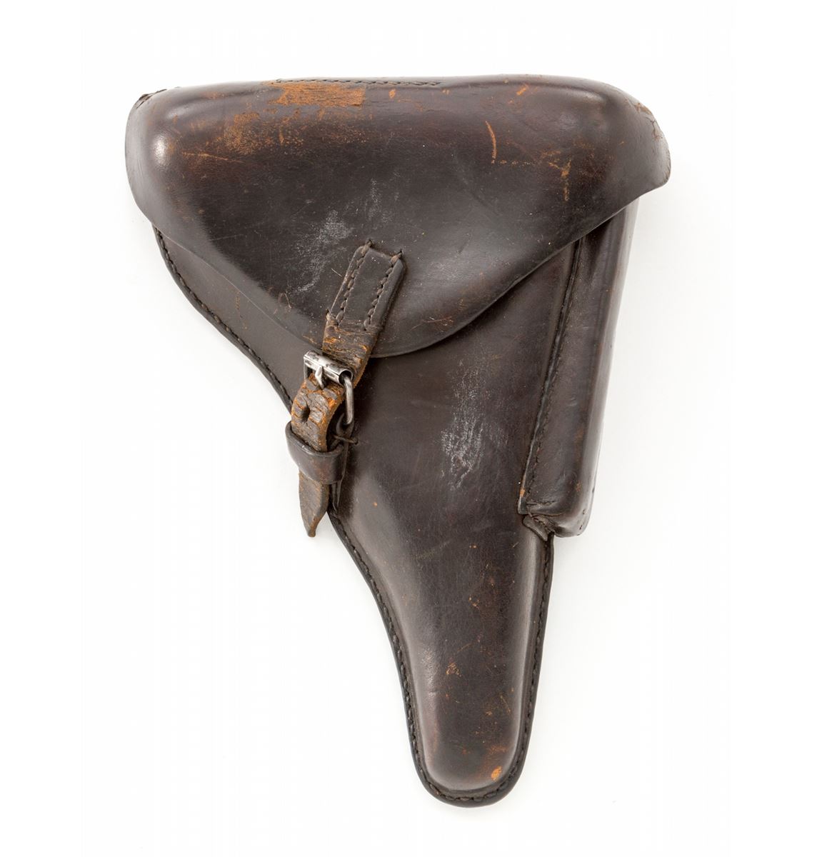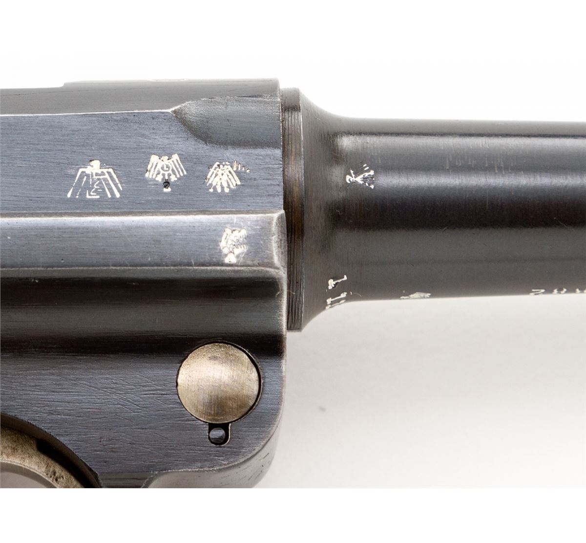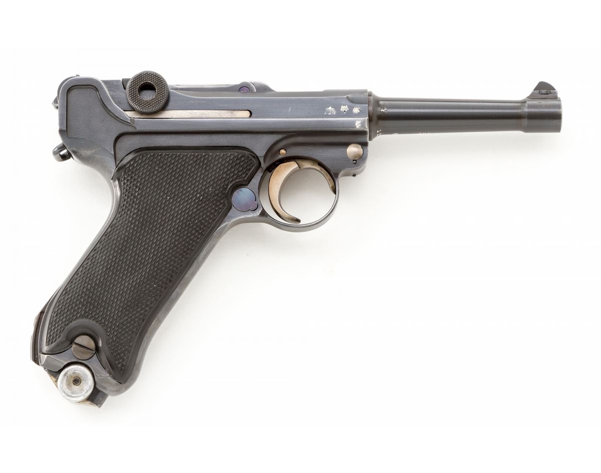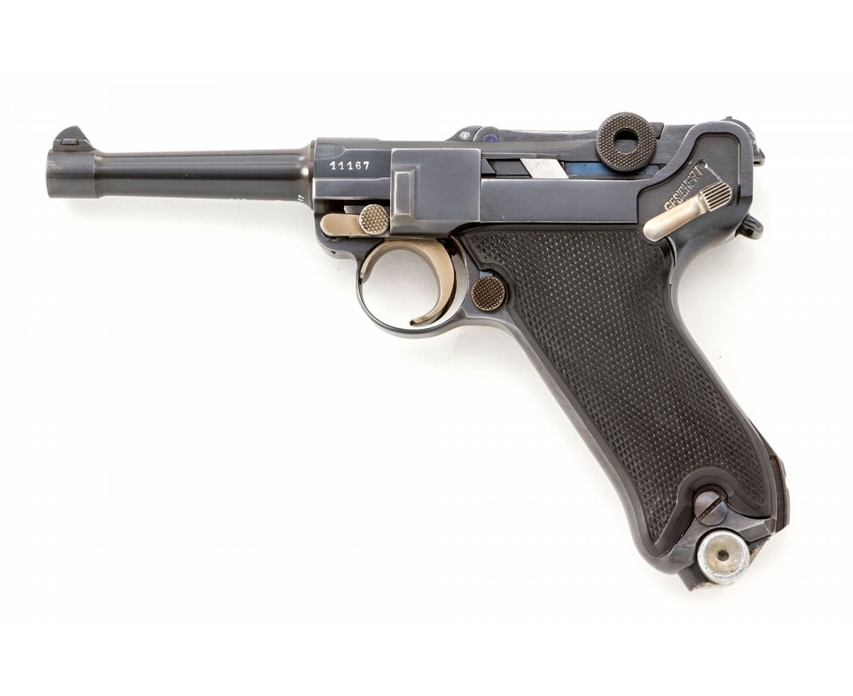 Rare 1940 Dated Krieghoff Luger, #11167, 9mm, 4'' barrel, salt blue finish with straw small parts, factory molded black checkered plastic grips with smooth border, and two matching numbered blue-bodied extruded magazines with pinned aluminum bases. Chamber dated 1940, standard Krieghoff anchor to central toggle, ''Gesichert/Geladen'' marked thumb safety and extractor, with full complement of Luftwaffe component and inspection markings. In 1940 dated brown leather holster. Considered rare with only 1100 mfg'd. Condition is excellent retaining approx. 98% original lightly toning blue. Grips and action are crisp, bore is bright. Holster with tight stitching and light scuffs and scratches. Est.: $5,000-$7,500. (C&R/PPT) (John Siroonian estate)