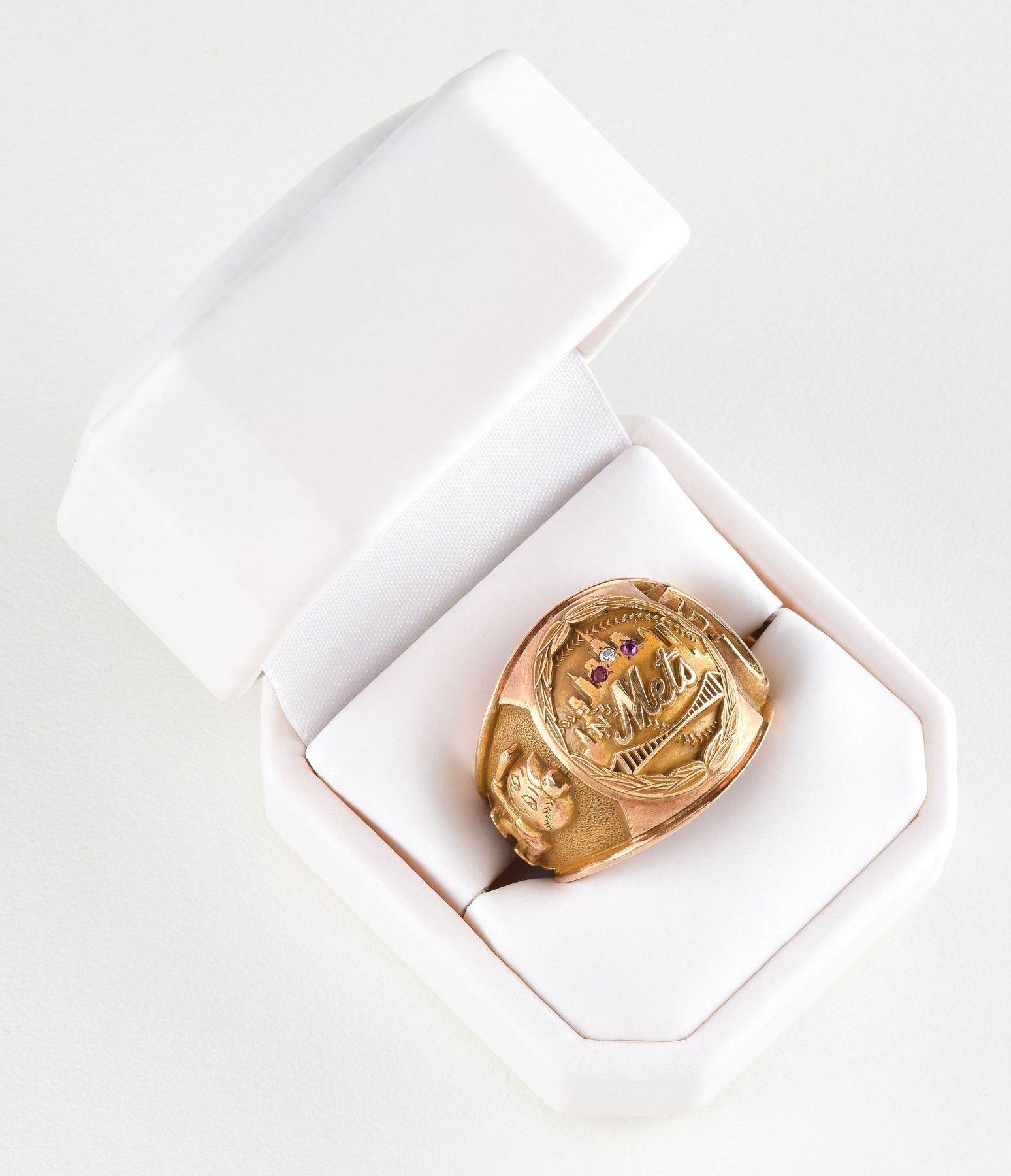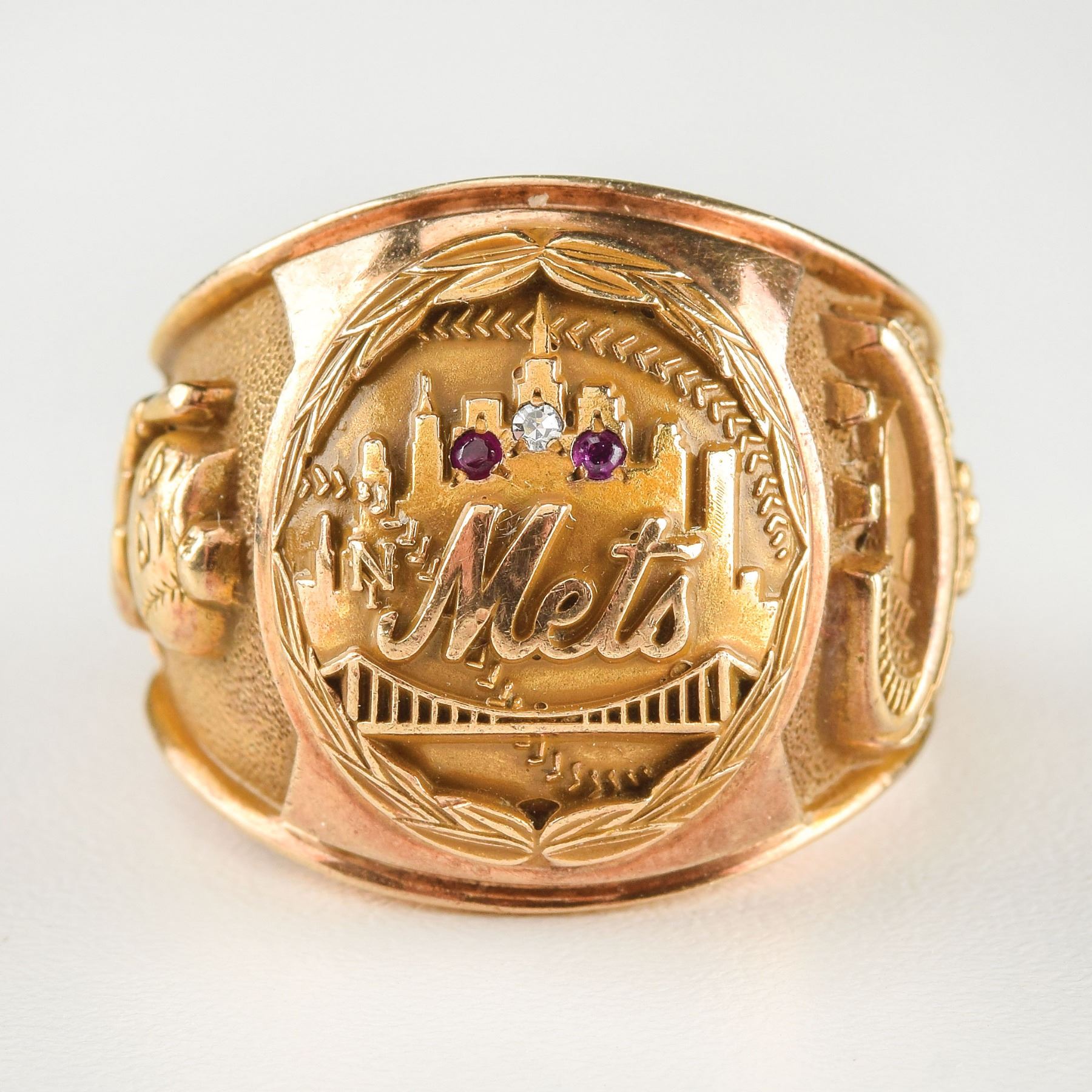 Shea Stadium was constructed for the 1964 season, and the New York Mets issued commemorative rings to honor this new stadium opening. Marked 10K "Balfour" on the inside of the band, the rings also has the mascot "Mr. Met" on one side, and the stadium on the other, both in raised relief. The top has two tiny rubies and a diamond set above the Mets logo and the bridge to Flushing. This ring is extremely high quality and had a very limited distribution. Kiner was there from the beginning as part of the Mets broadcast team, and this ring is his personal copy. It appears to never have been worn and was likely stored away for the past 50+ years. Near Mint to Mint condition. Full LOA from University Archives (John Reznikoff), cert. #11077.