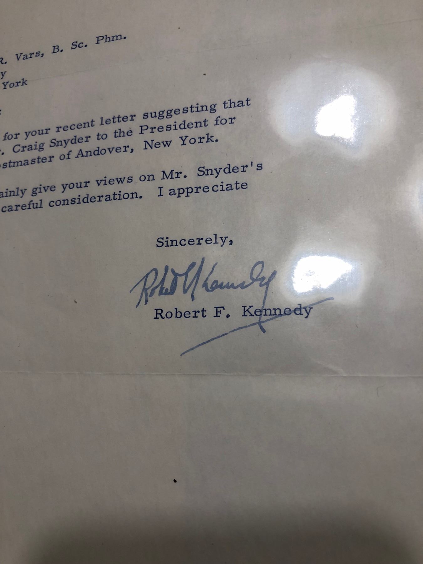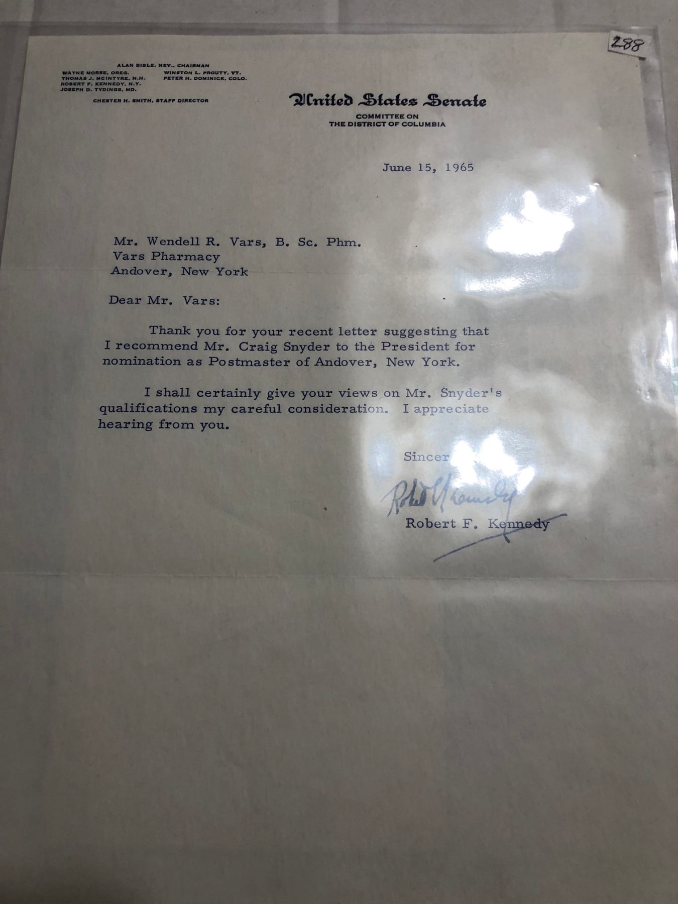 Rare 1965 Signed Robert F Kennedy Letter on US Senate Letterhead with Envelope. Recommendation Letter for Mr Craig Snyder to the President for nomination as Postmaster of Andover, New York. United States Attorney General from 1961 to 1964 and a US Senator from New York from 1965 until his assassination in 1968.