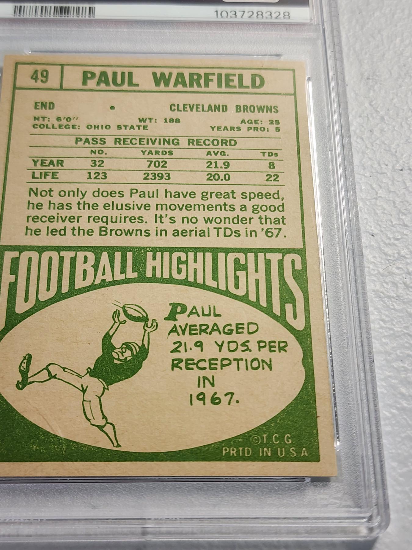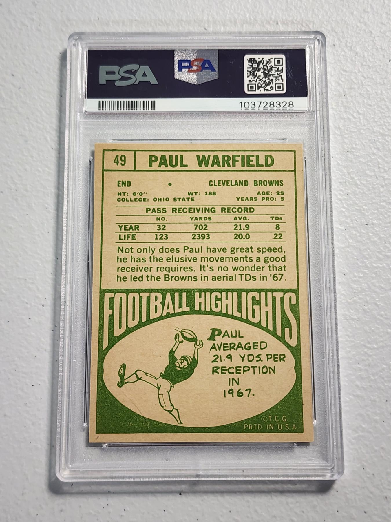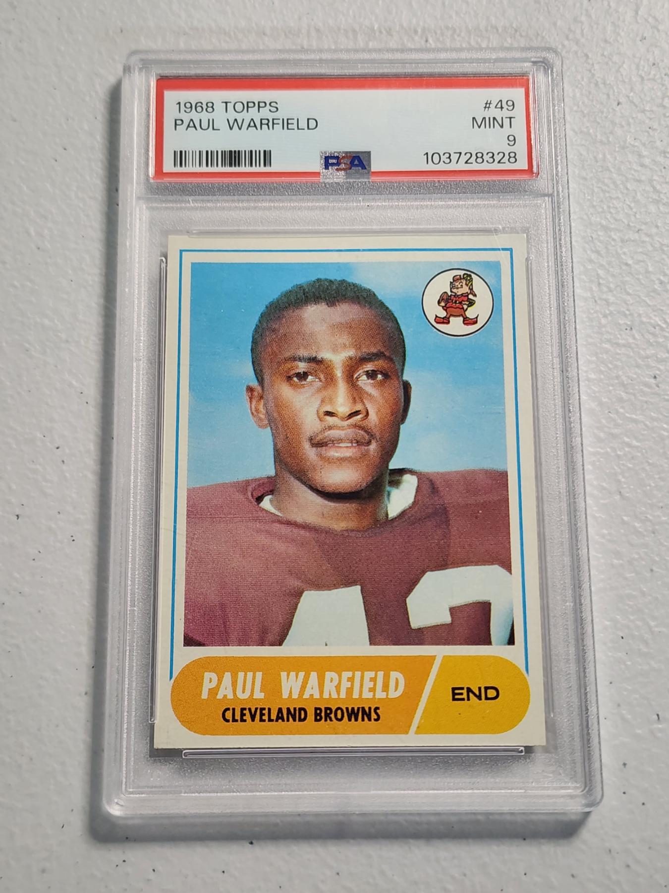 Rare 1968 Topps Paul Warfield Cleveland Browns #49 Trading Card Graded PSA Mint 9 Excellent Card!
