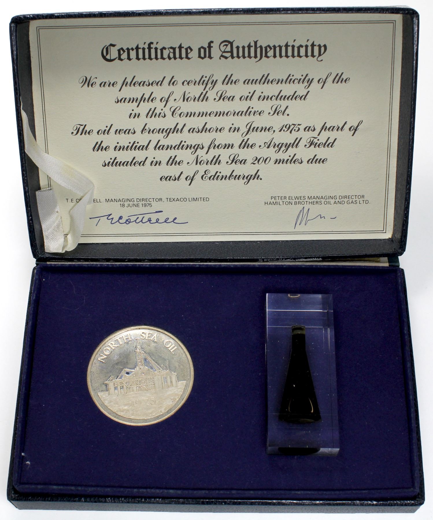 *Rare* 1975 North Sea oil Limited Edition Medal set. Included with this set is a certified sample for North Sea Oil and a Silver Medal with the original coa. The coin is 4.5cm in diameter and weighs 42g. Packaging is worn and medal is toned.