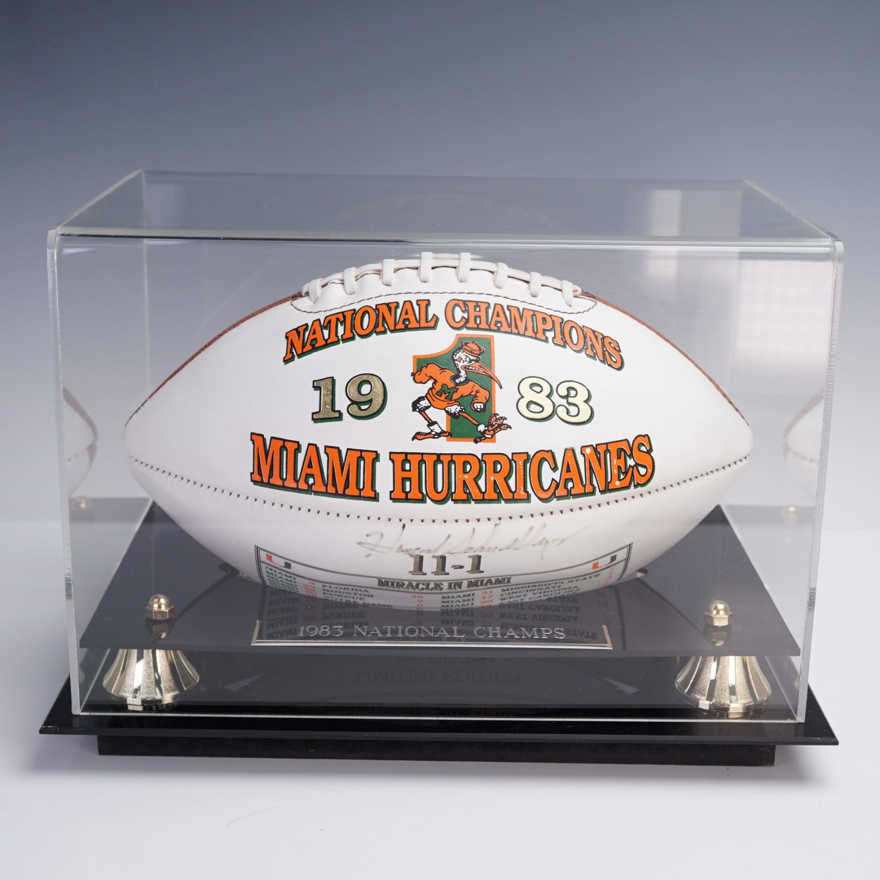 A commemorative 1983 National Champions Miami Hurricanes football presented in a clear display case, celebrating the team's 11-1 season and victory. The white panel features bold lettering in orange and green with the Hurricanes logo, flanked by the championship year "1983," along with a printed schedule and results. The piece includes head coach Howard Schnellenberger signature. Accompanying this is a Baden Pro Shape autograph football, model FX500A-26, crafted in full grain leather and marked with the manufacturer's details on the reverse. Together, these items form an evocative tribute to Miami Hurricanes football history.